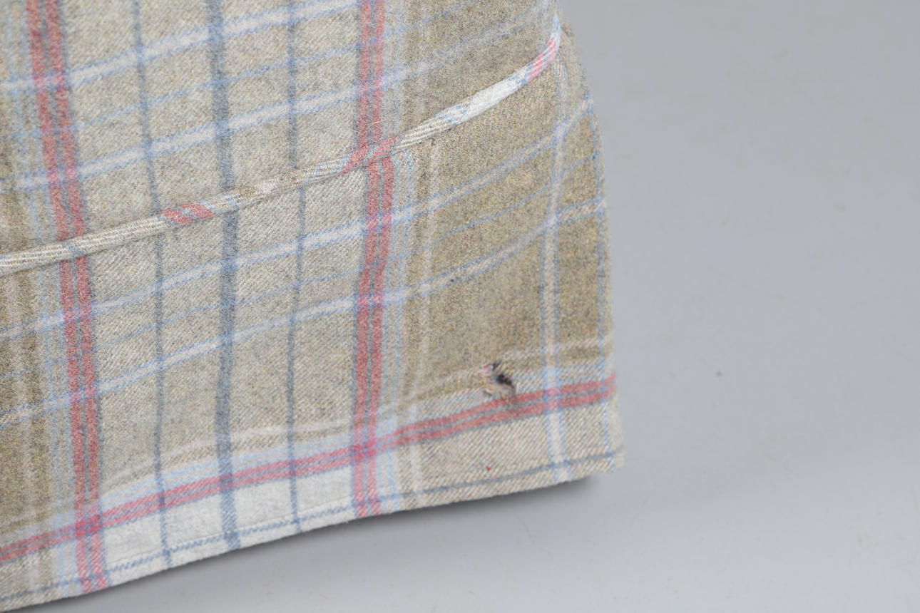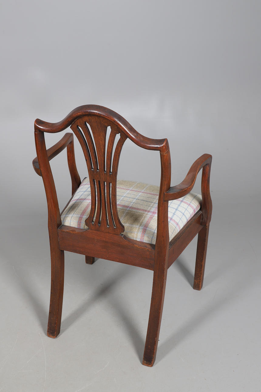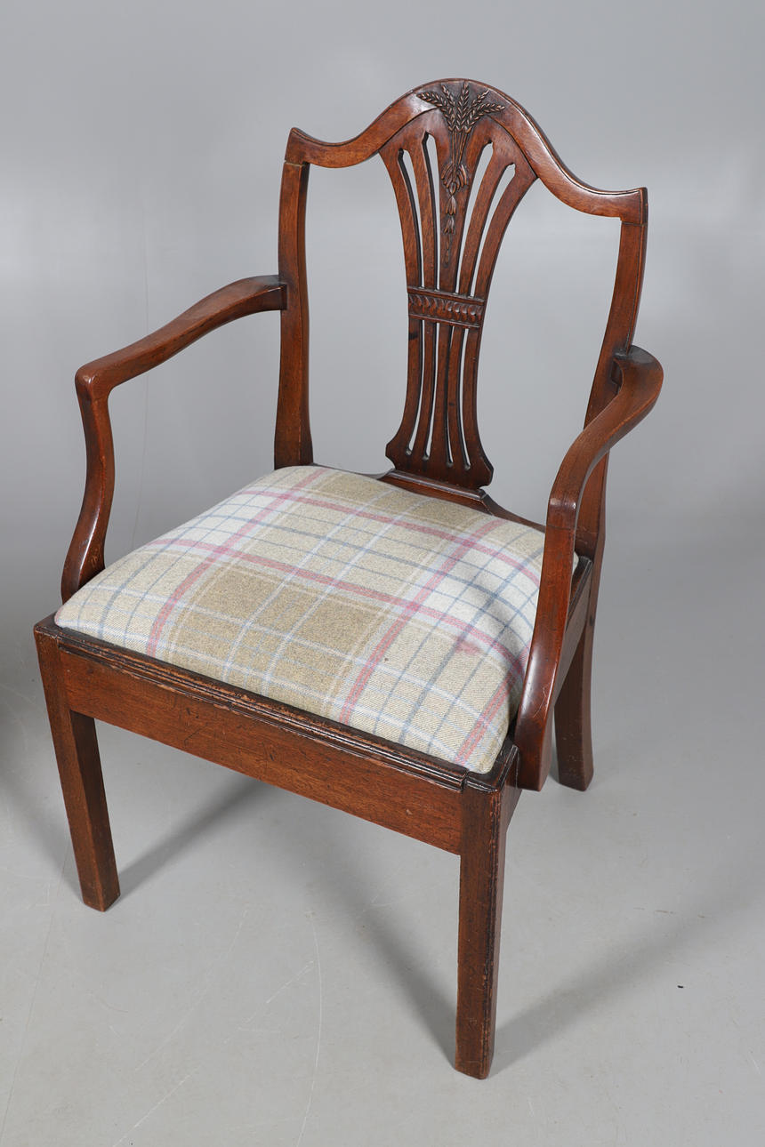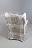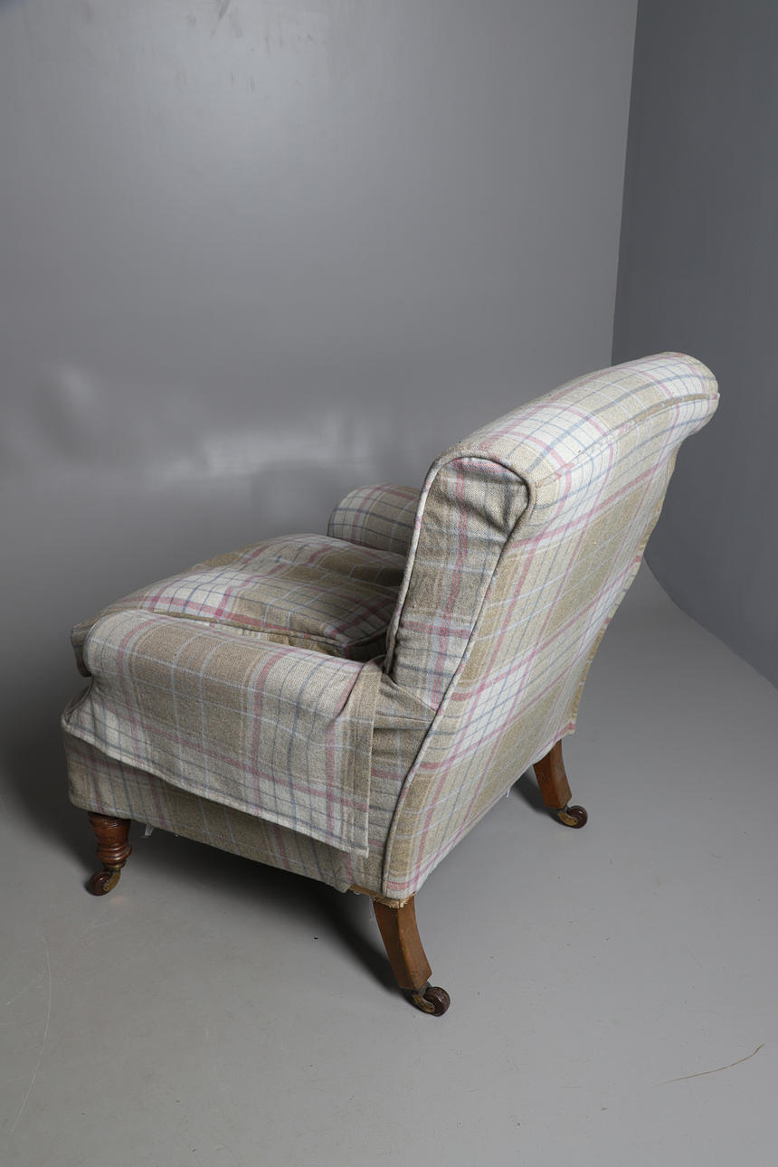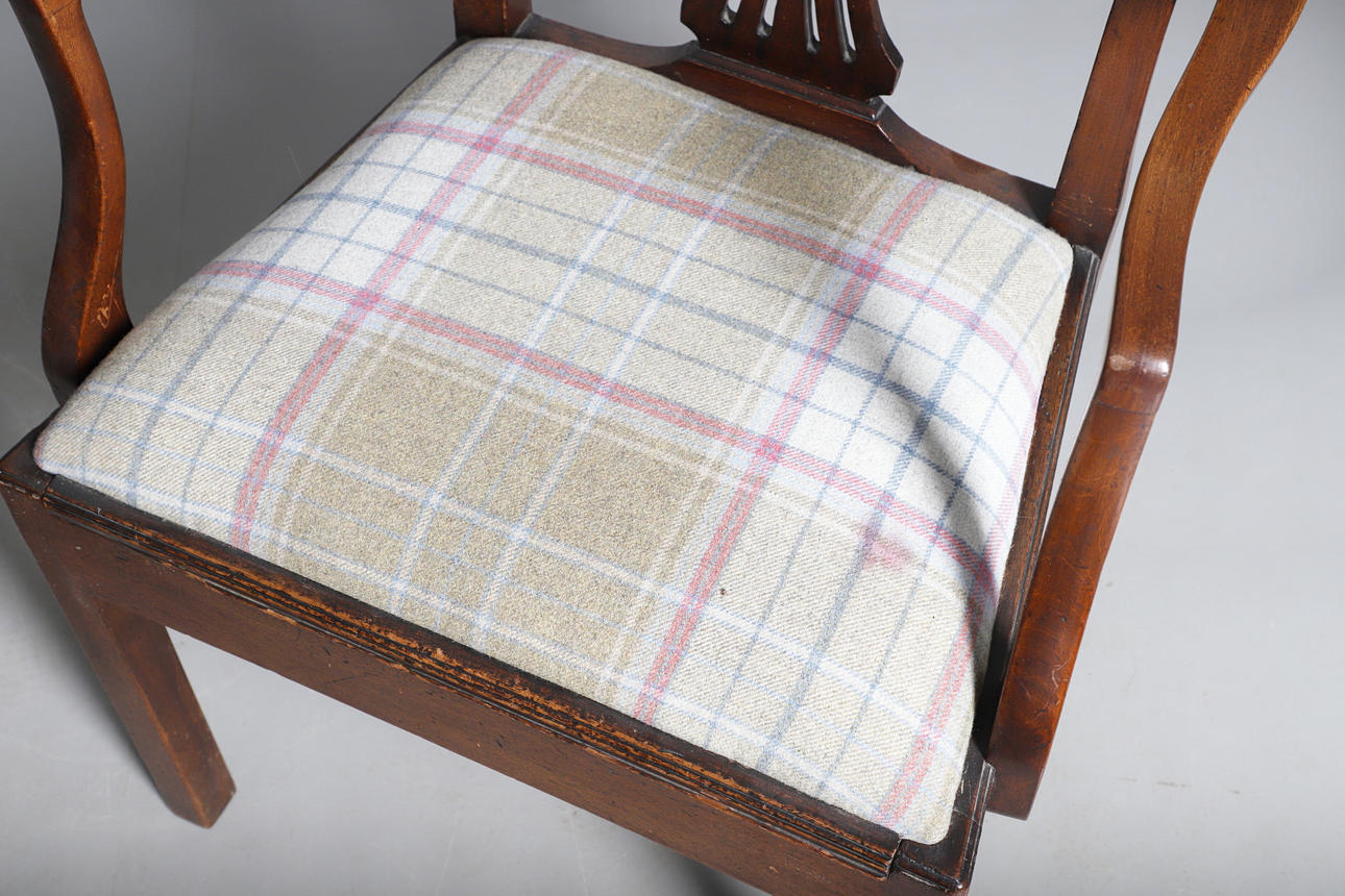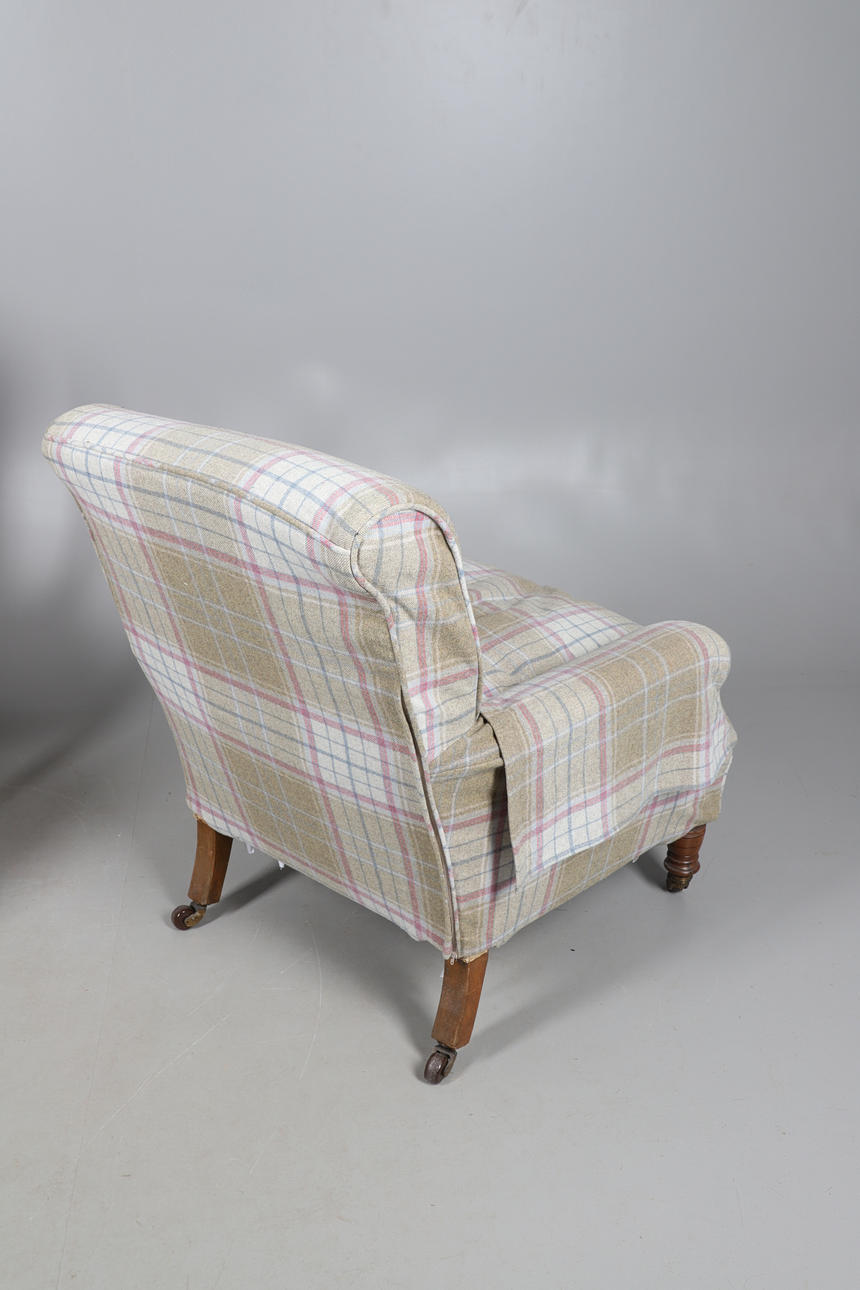 upholstered in wool check fabric with feather filled seat cushions, 92cm high x 81cm wide x 82cm deep, and 105cm high x 73cm wide x 75cm deep; together with a 19th century mahogany elbow chair, the drop-in seat with matching fabric (3).