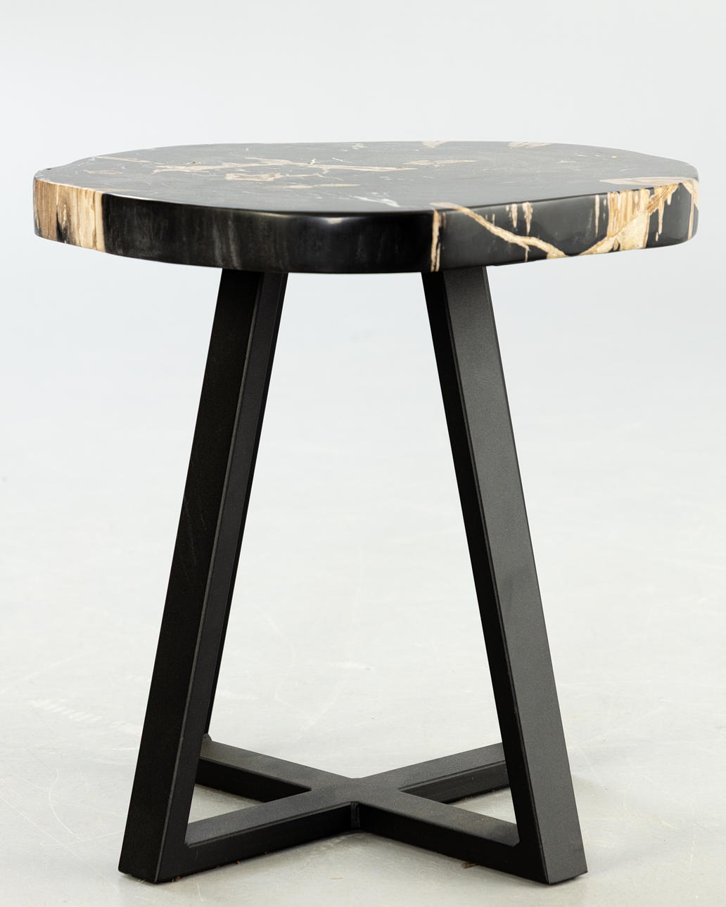 Petrified wood table top, steel frame, painted black.