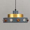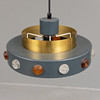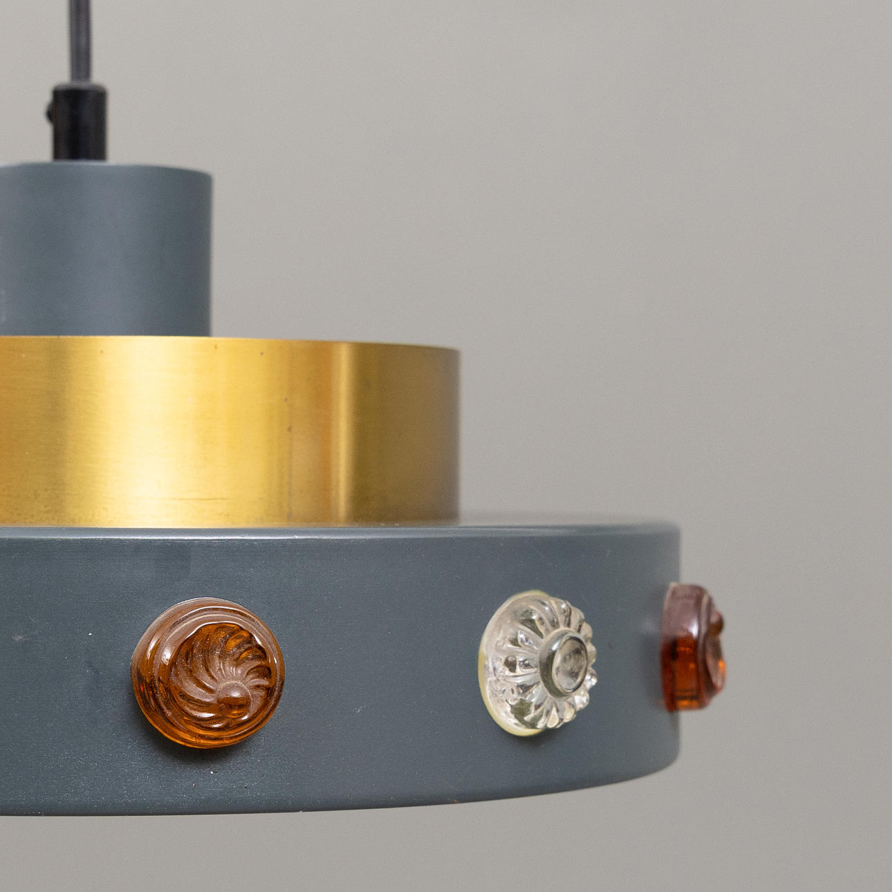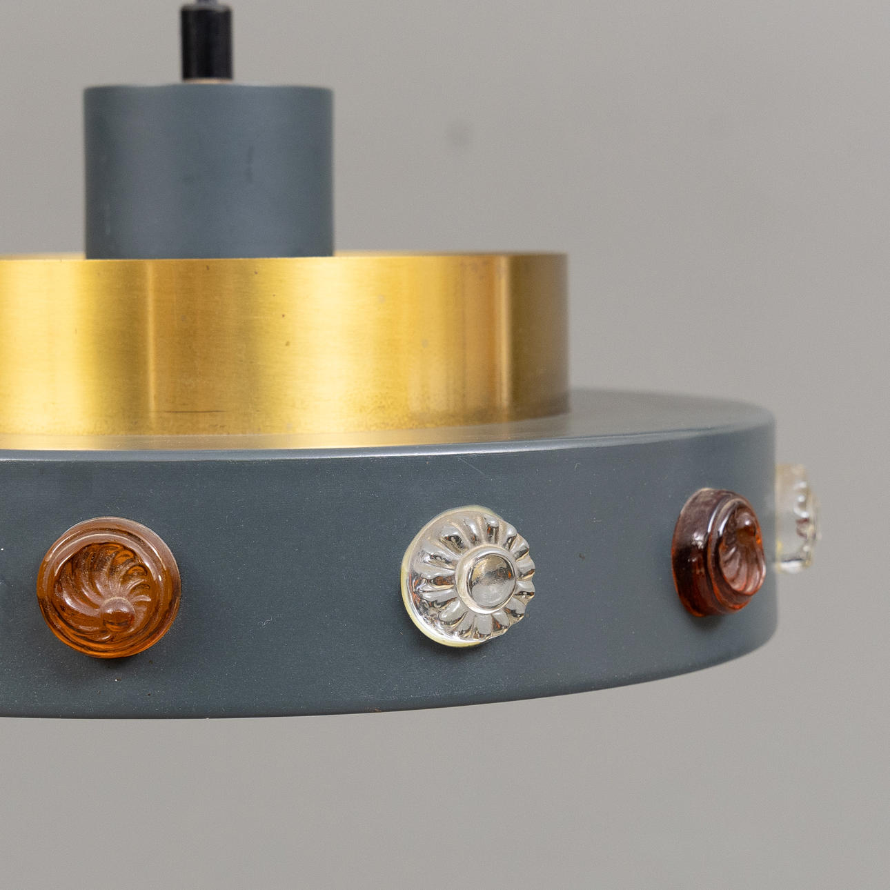 Round ceiling lamp in brass and lacquered metal, with colored glass elements.