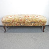 Bench/seat cushion with curved legs in dark stained wood. Solid upholstered seat with patterned upholstery in plush, with flowers/foliage in polychrome colors against beige bottom.