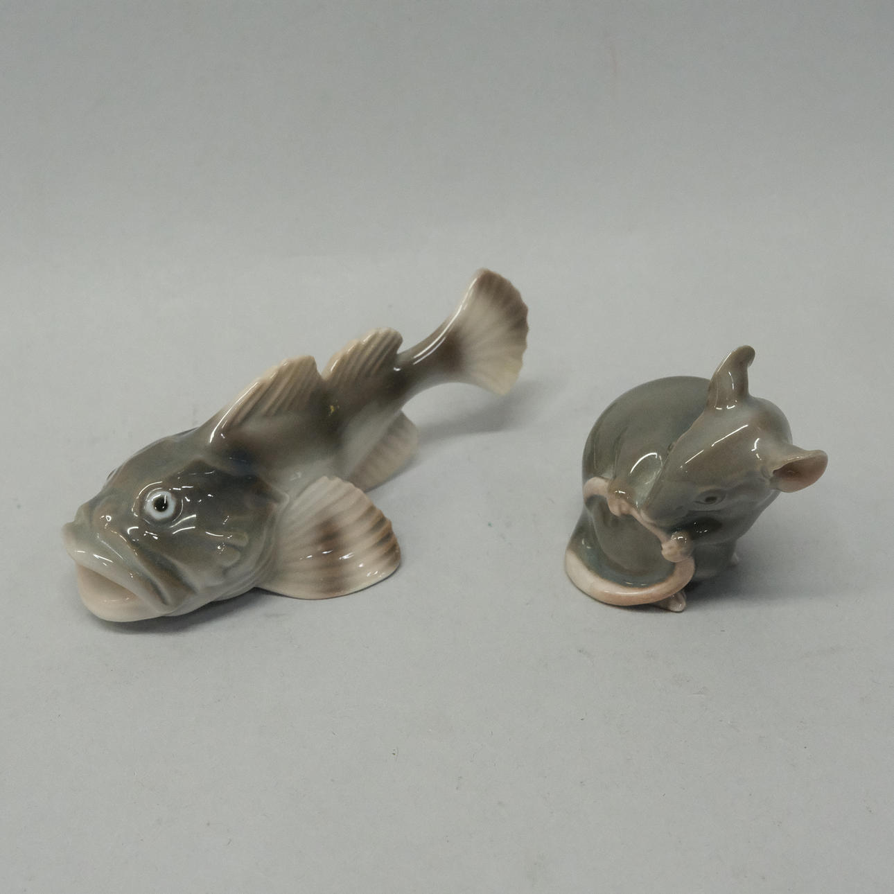 Porcelain ed painting under the glaze: 1 Hazelmus, no. 1801, height 45 mm and 1 monkfish, no. 2144, length 100 mm.