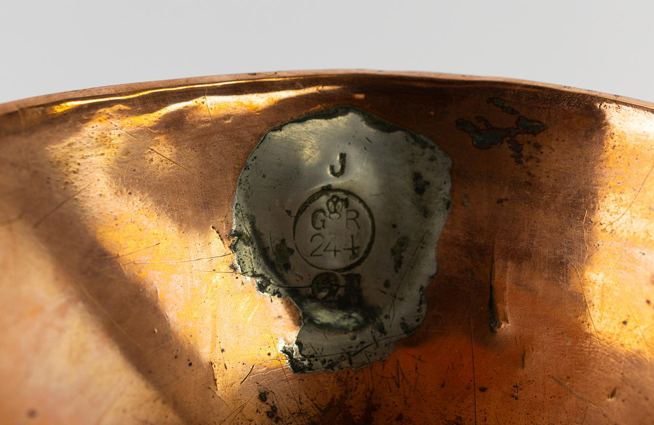 copper, one mould 15cm t x 15cm w, the other 13cm t x 17cm w and a copper jug 39cm t (3).