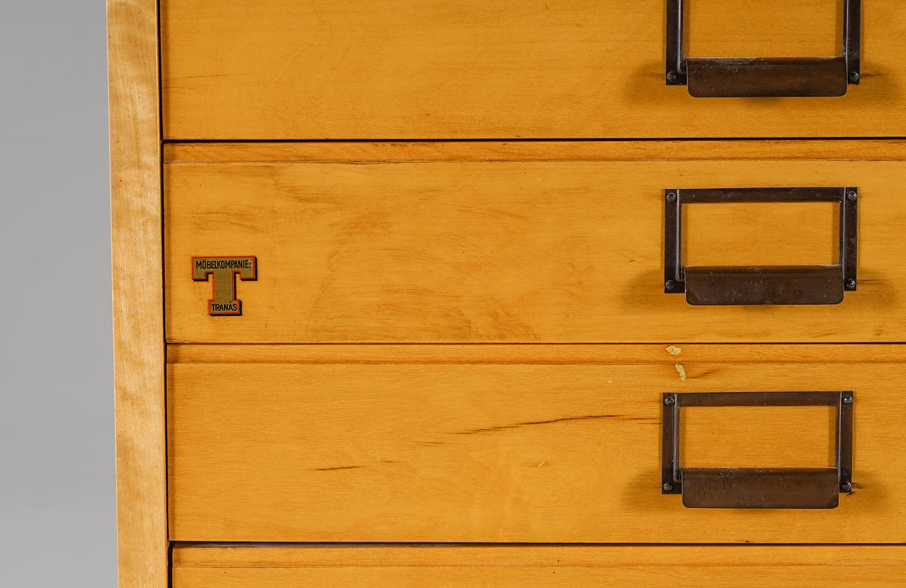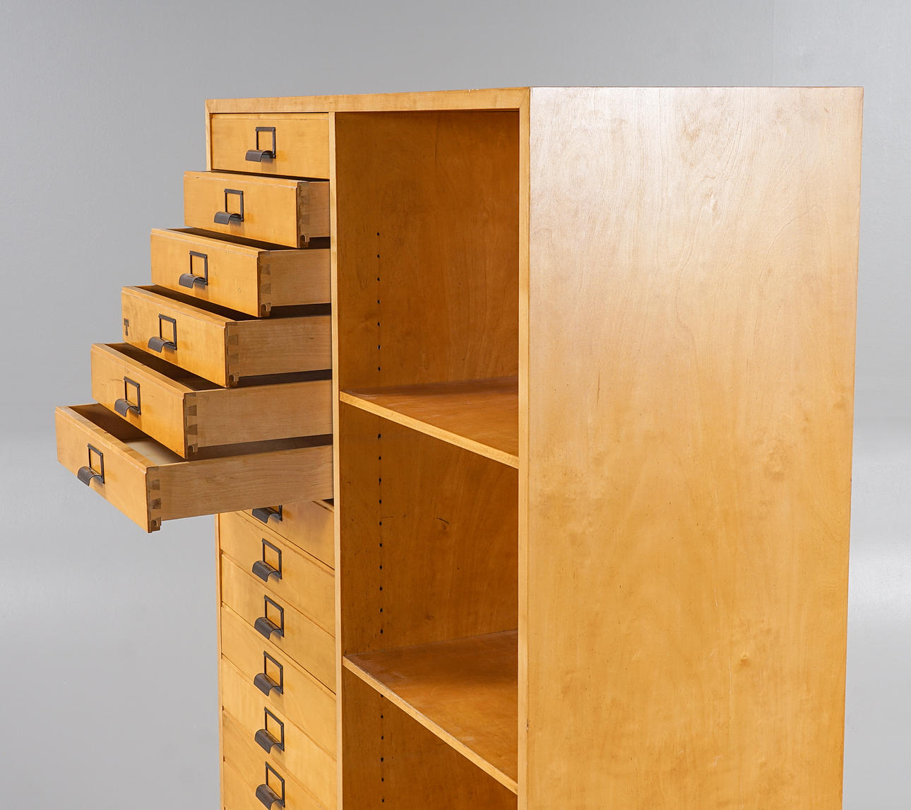 Veneered with birch, 15 drawers, 2 removable shelves.