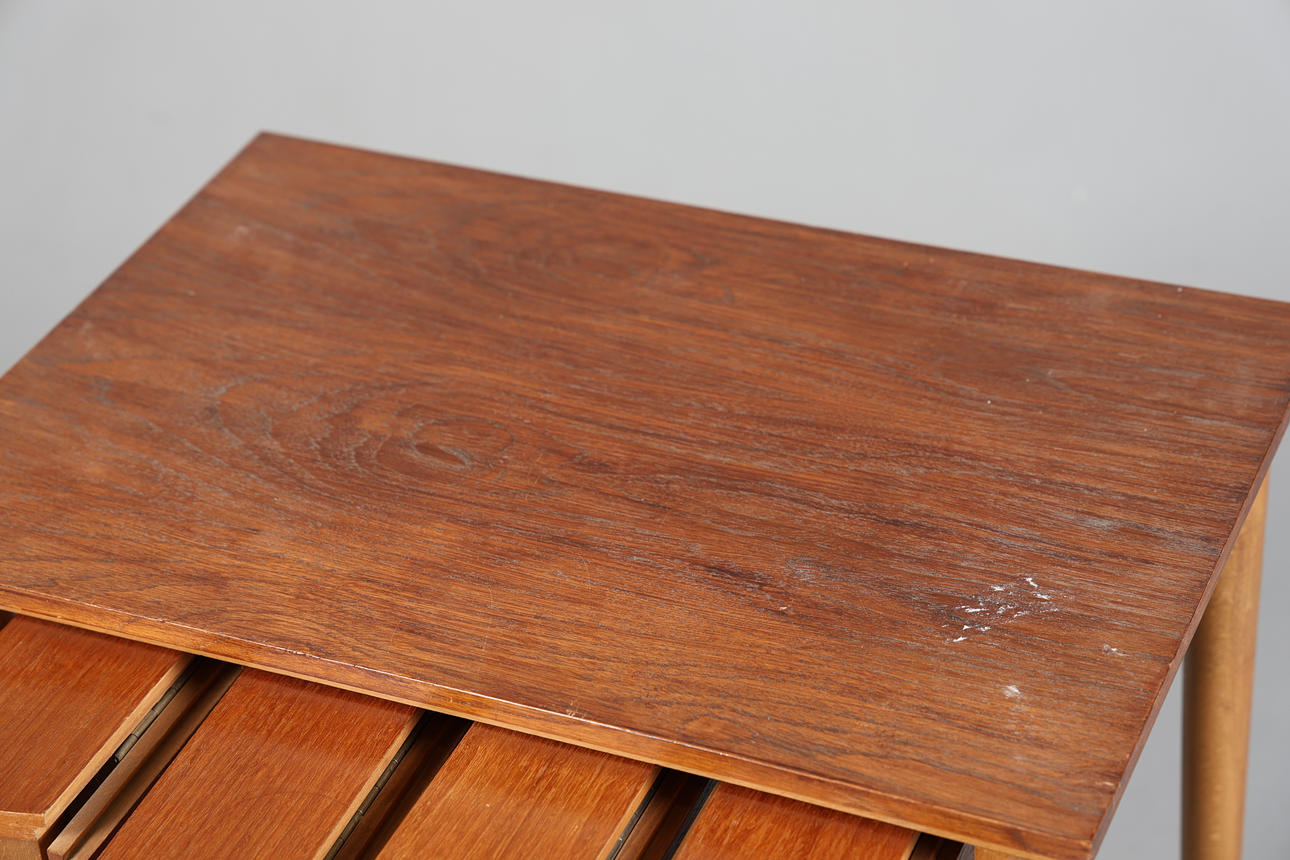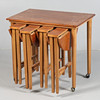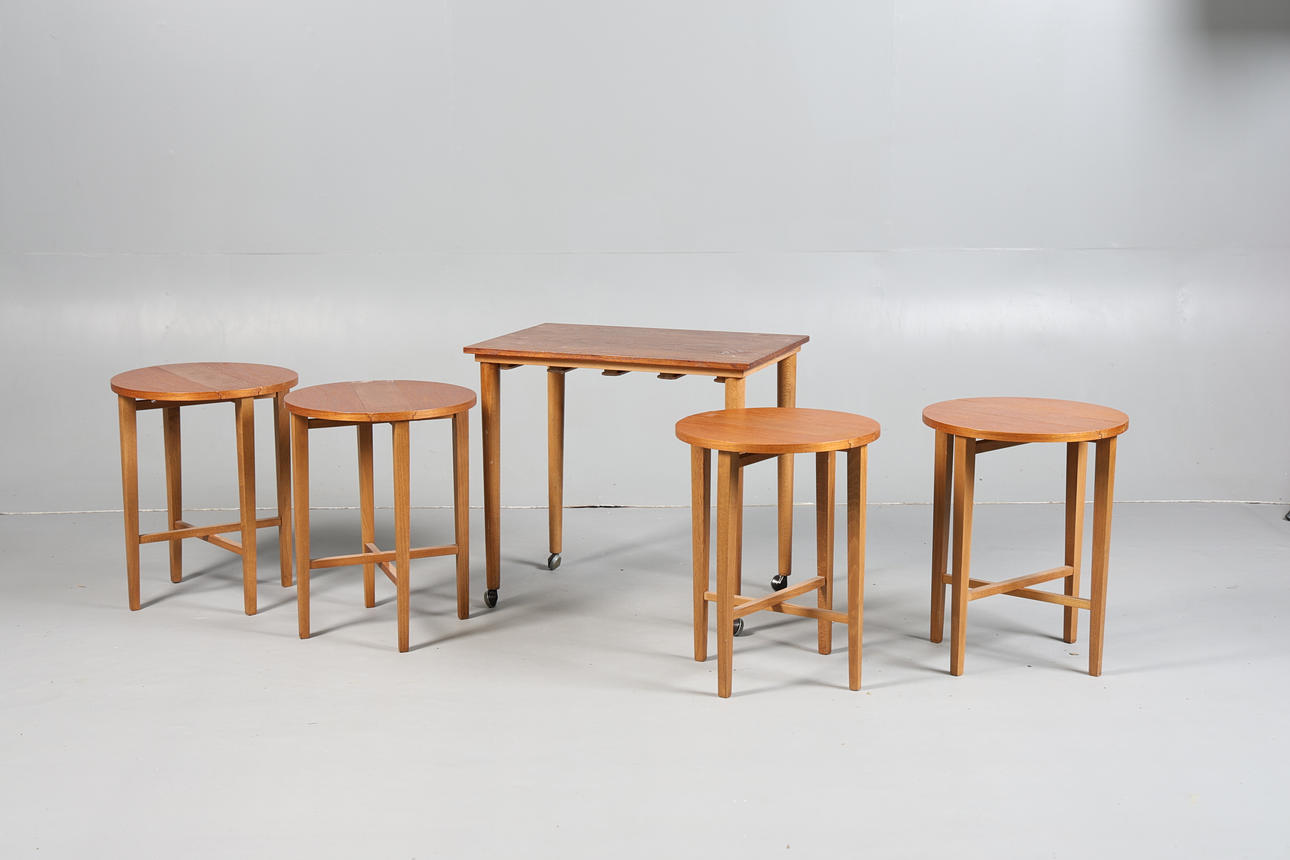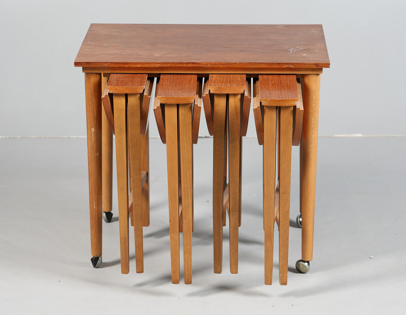 The Danish teak side table with a further four folding drop-leaf tables underneath, raised on castors, the largest measures 56.5cm height, top measures 62cm x 42cm.