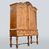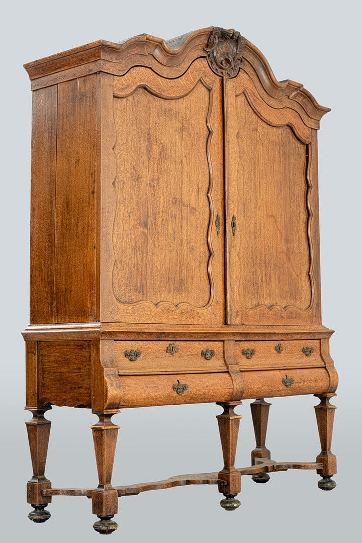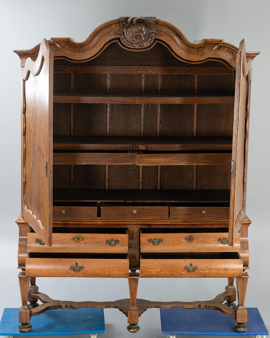 oak. Curved cross braces between articulated, balusted legs. Slightly cambered frame with four drawers. Passive seed seed on the segmental pediment. 2-door, internal shelves and drawers.