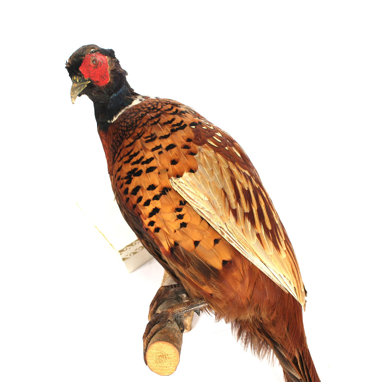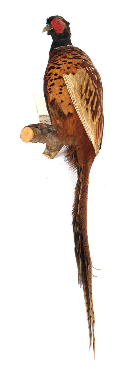 4383946. TAXIDERMY, Stuffed pheasant, mounted on branch.