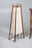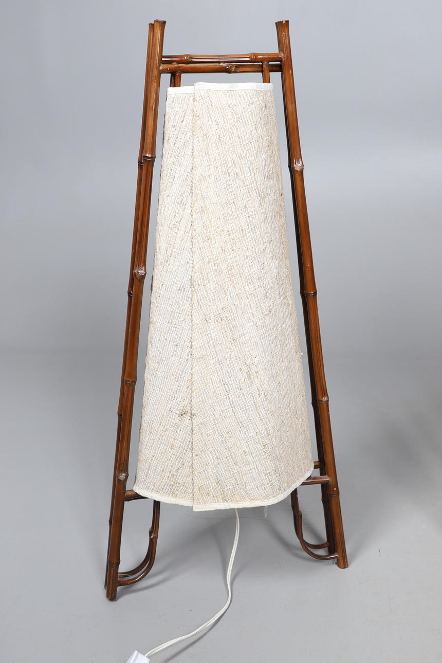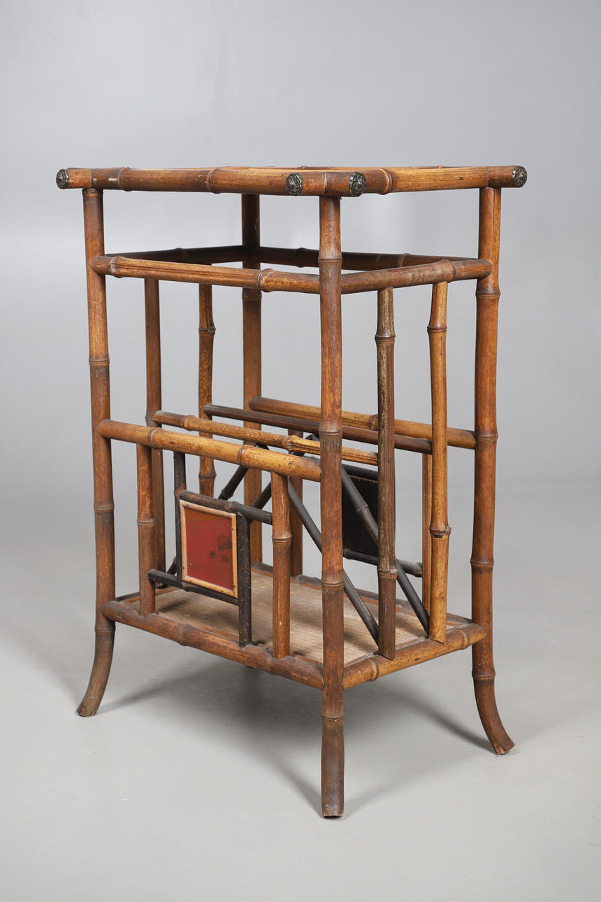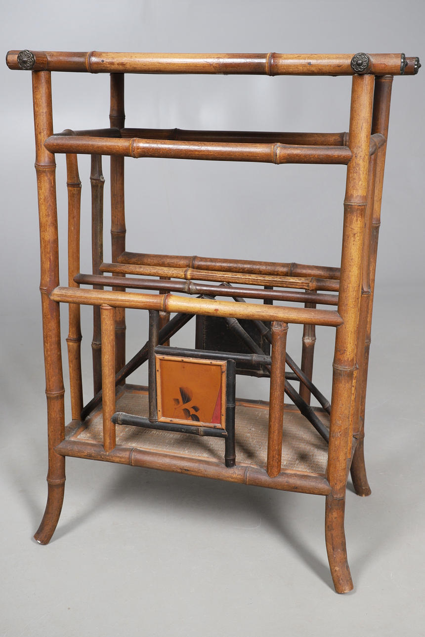 the top decorated in the Japanese style with bird and flowers, integral magazine divider below, 70cm high x 50cm wide x 35cm deep; together with a 1970s (?) bamboo floor lamp with folding frame and velcroed fabric shade, 81cm high x 31cm wide x 21cm deep.