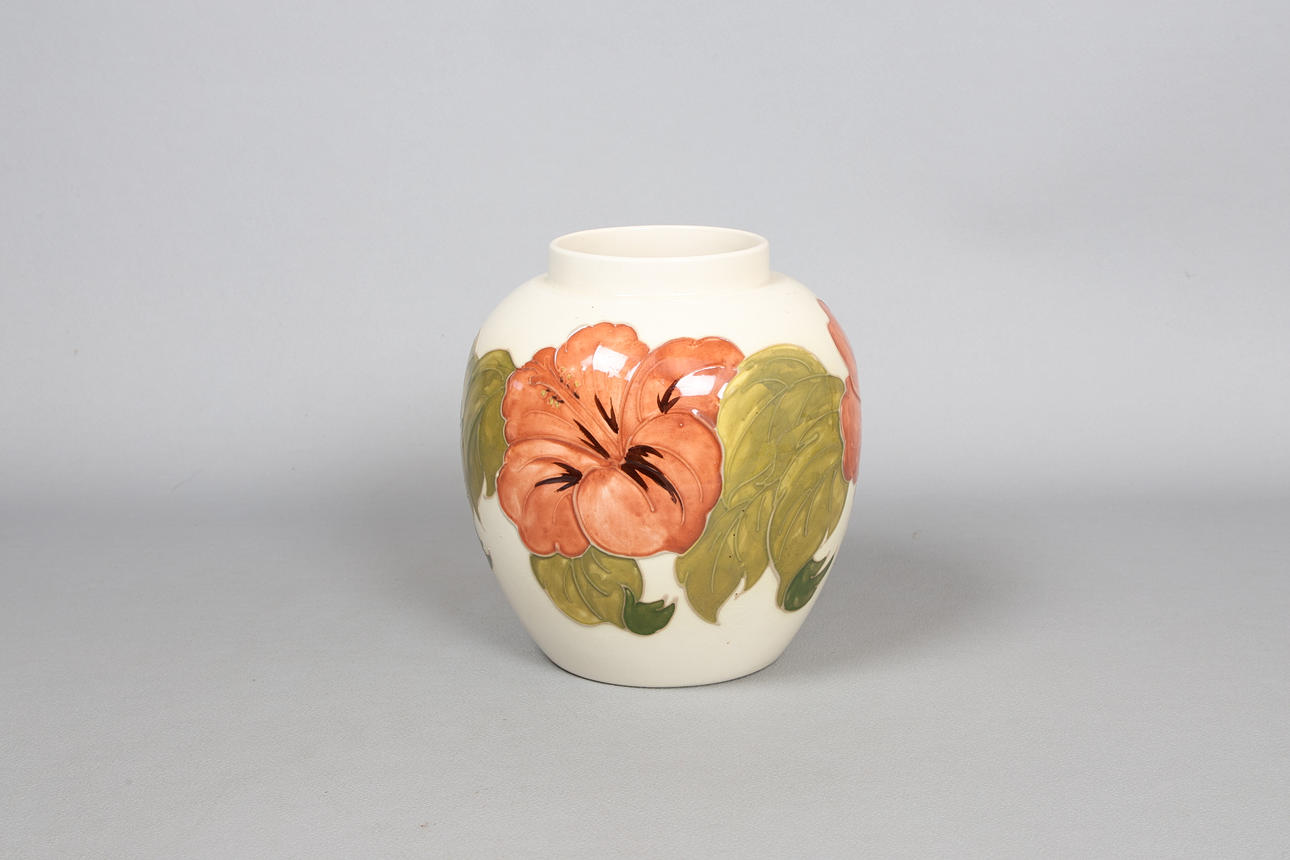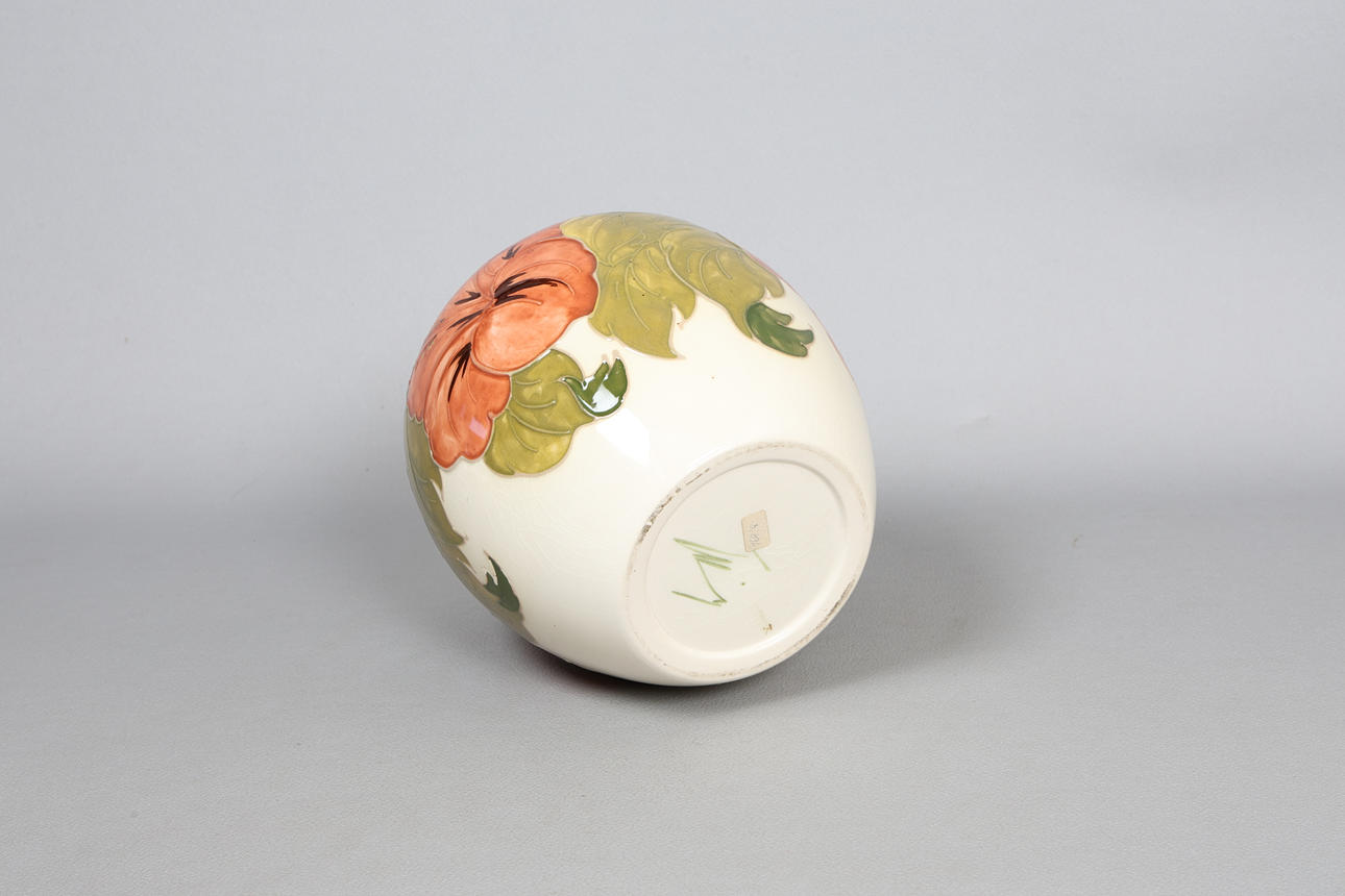 The Hibiscus pattern vase of bulbous form with tube line decoration, signed 'WM' to the base, 18cm height.