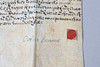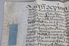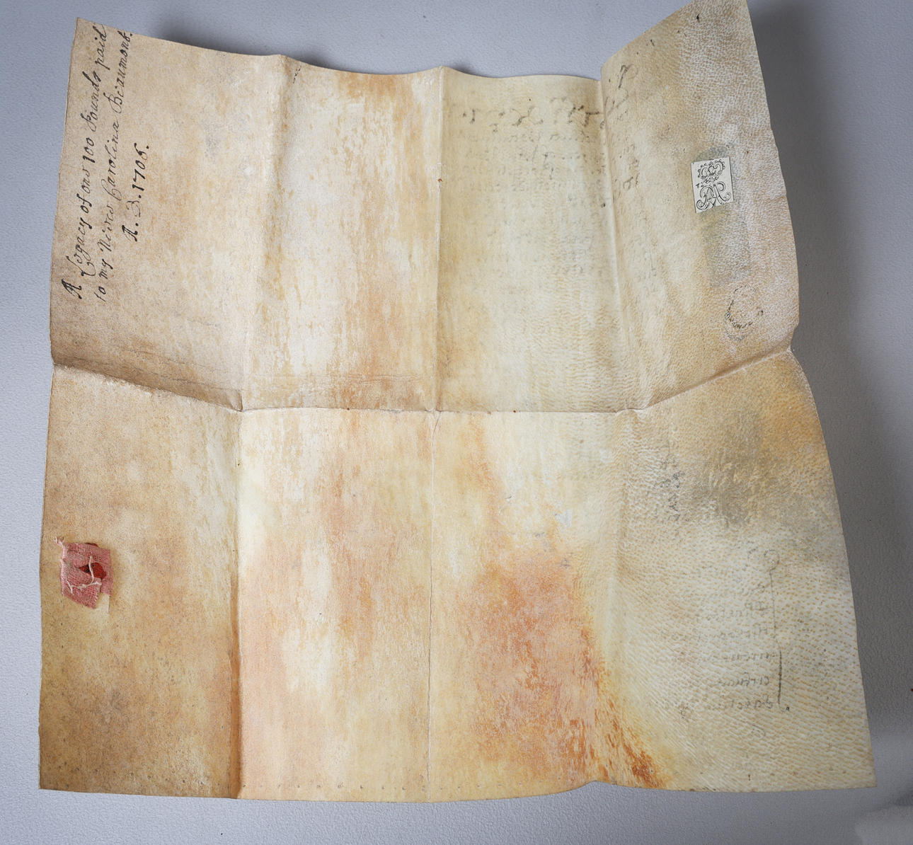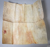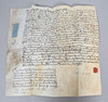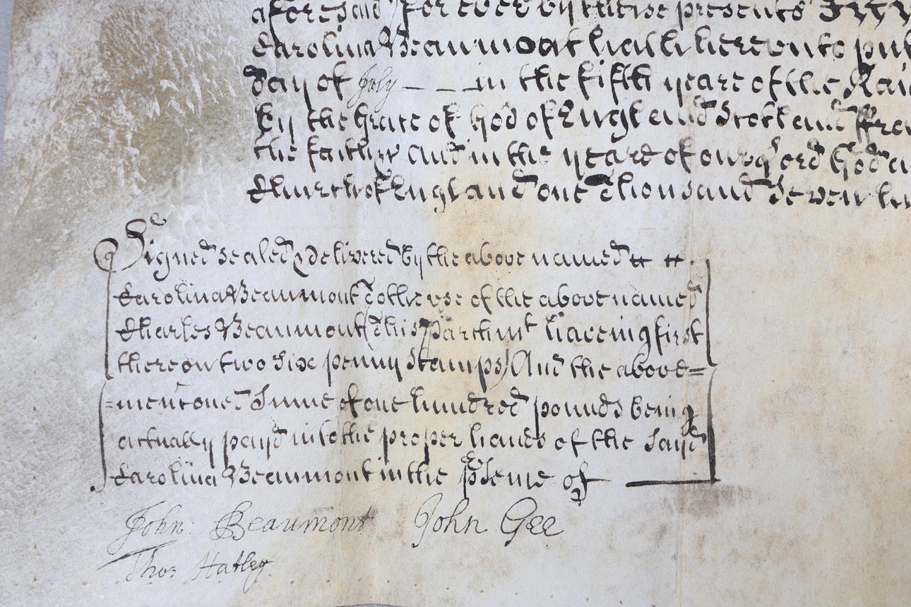 Manuscript indenture on vellum, it appears to read between Carolina Beaumont & John Gee and appear to be a prior marriage settlement which mentions lands and a transaction of money, and mentions a habendum clause confirming the permanent transfer of ownership or rights. 36cm by 34cm when fully opened.