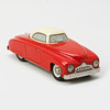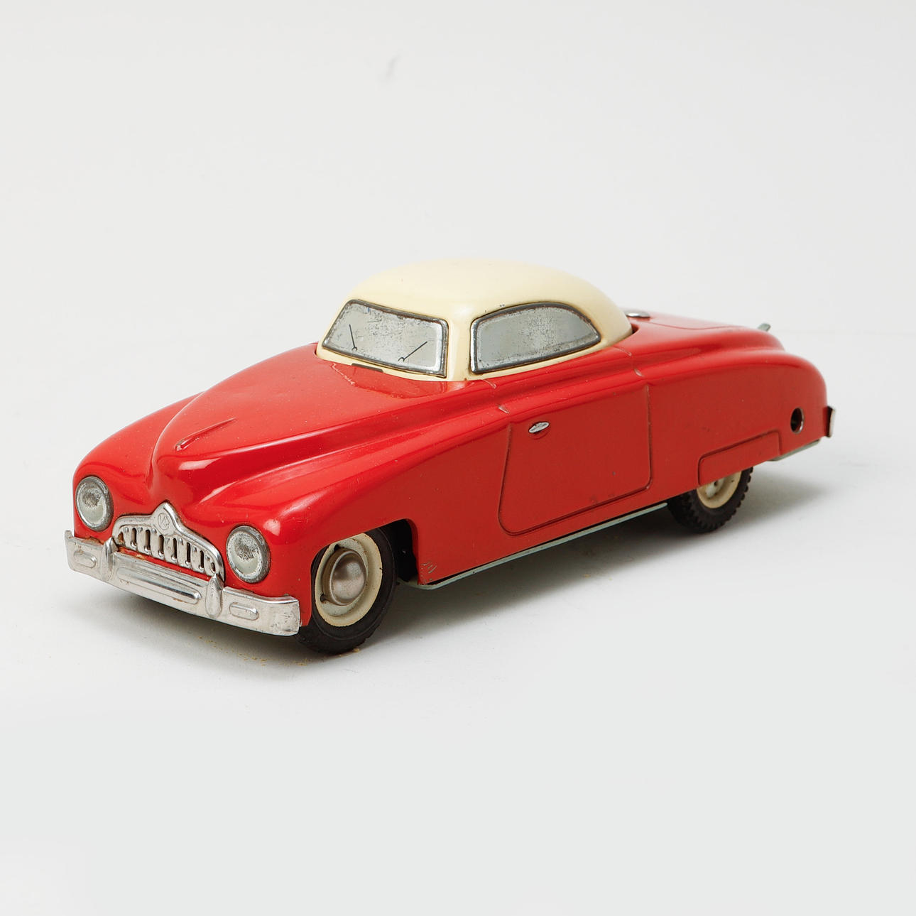 Lacquered and lithographed sheet metal, reversible interior from sedan to convertible, regulated by a lever underneath, adjustable front axle, clockwork driven. Length 23 cm.