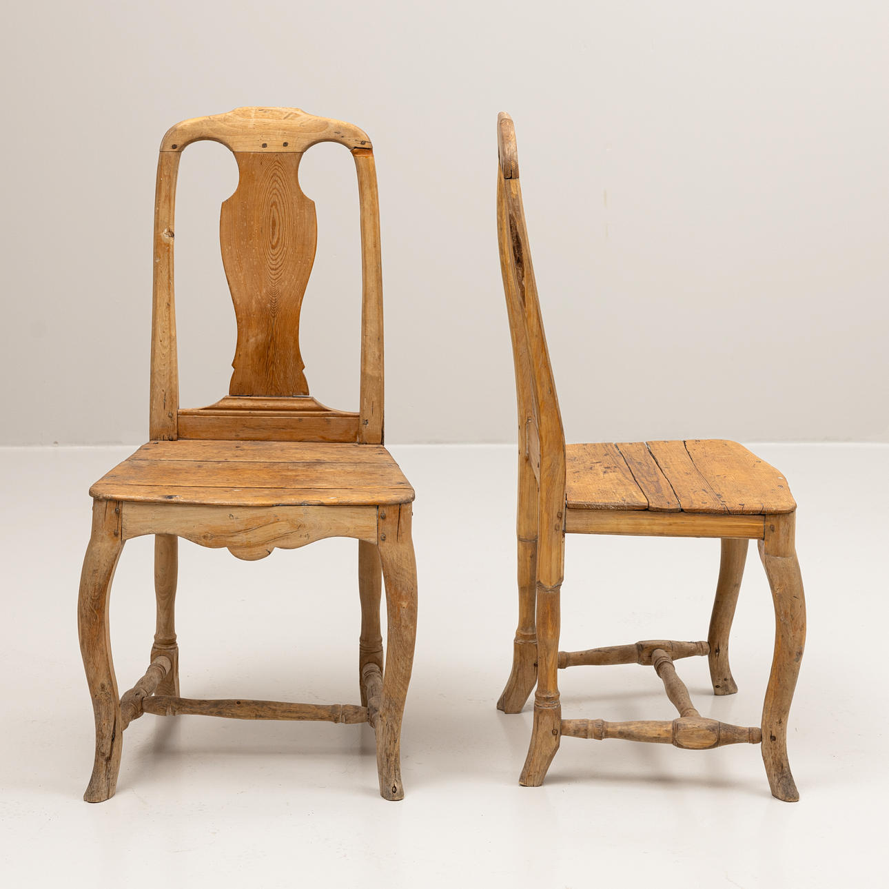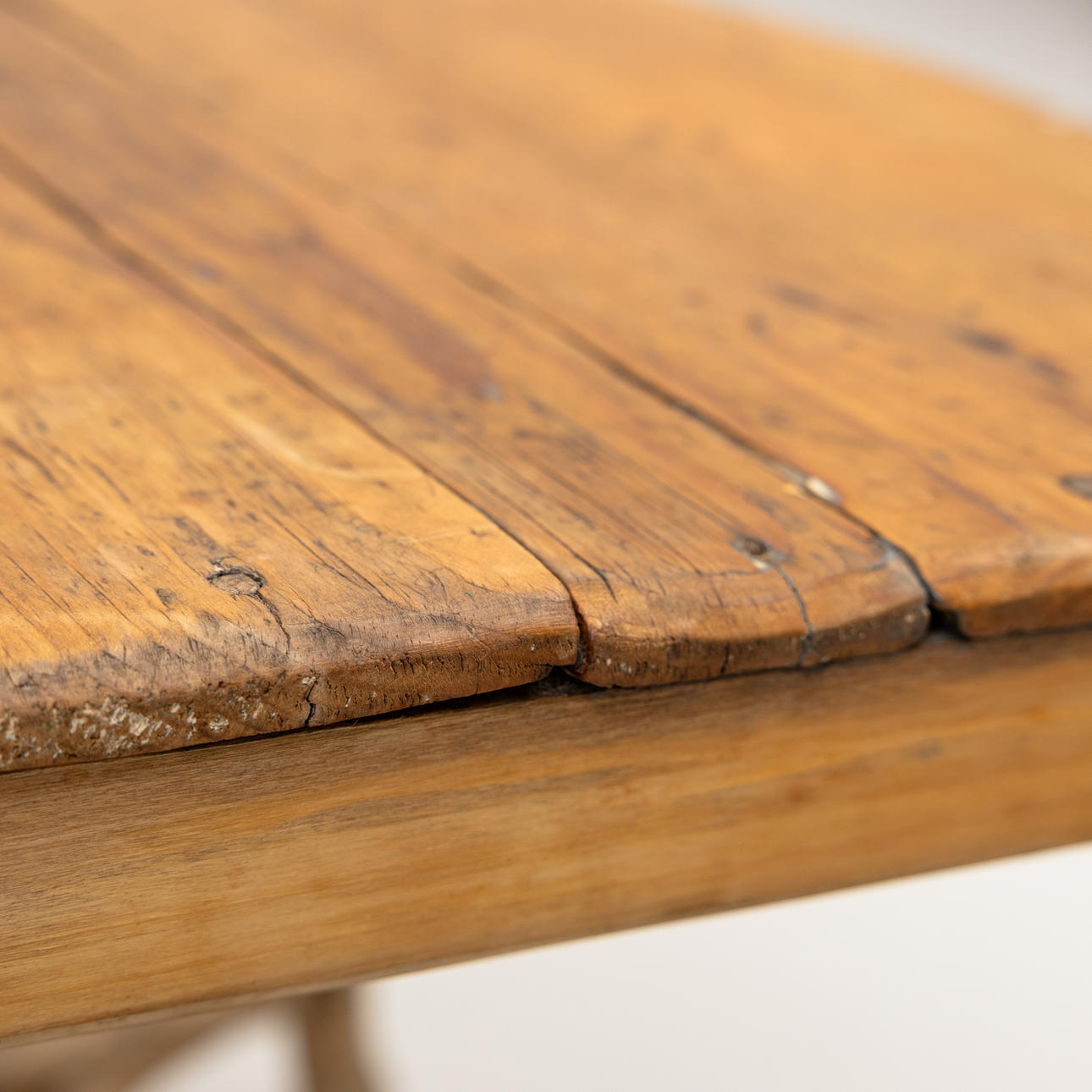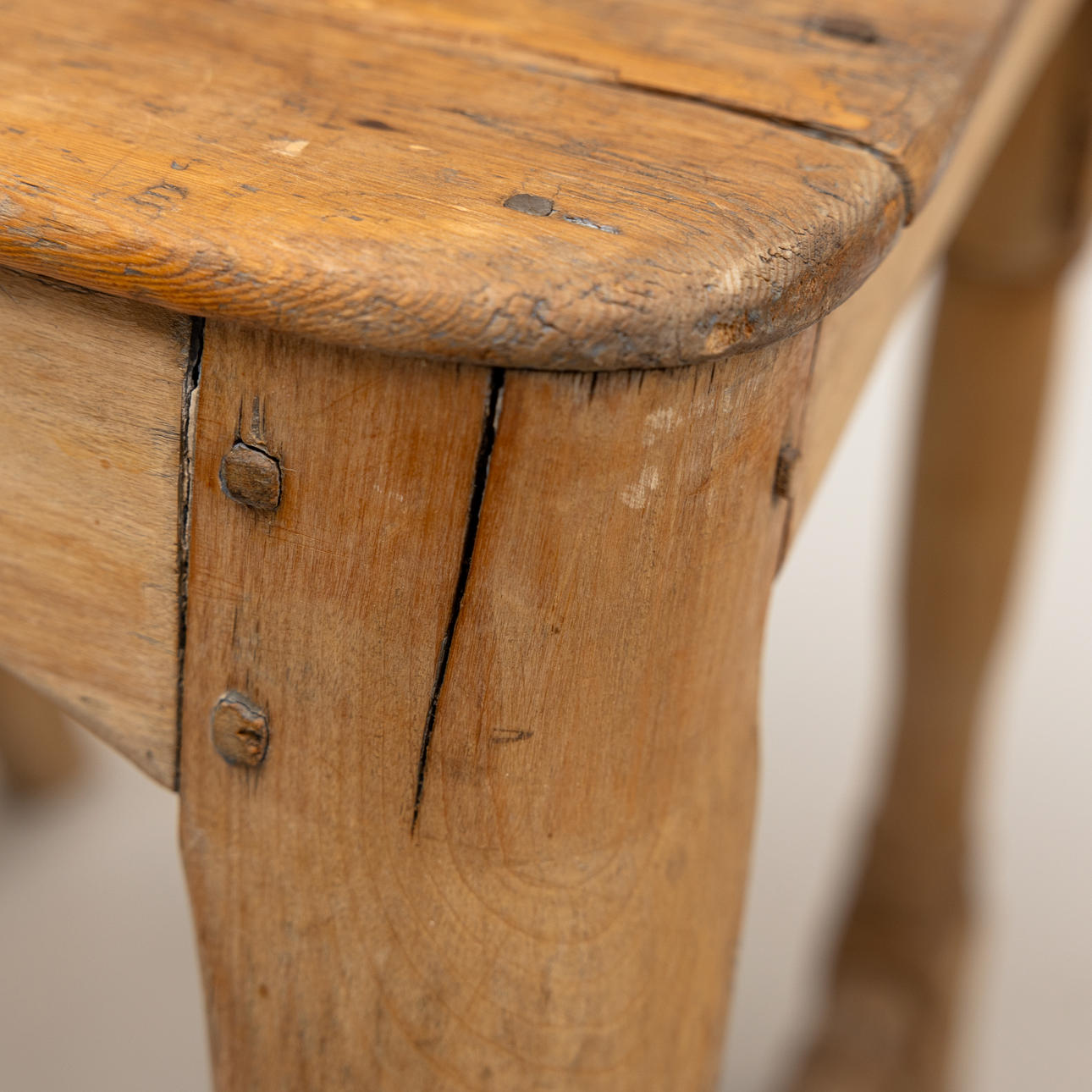 Age-related wear, damage, cracks, a seat partially loose. Deceased. Unstable. In need of renovation.