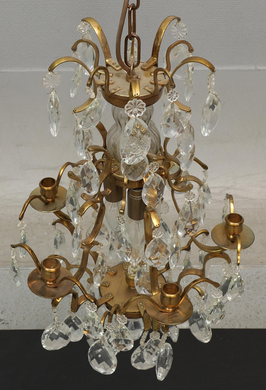 4384702. CRYSTAL CHANDELIER, Rococo style, with light arms, brass & prisms.