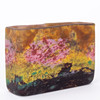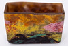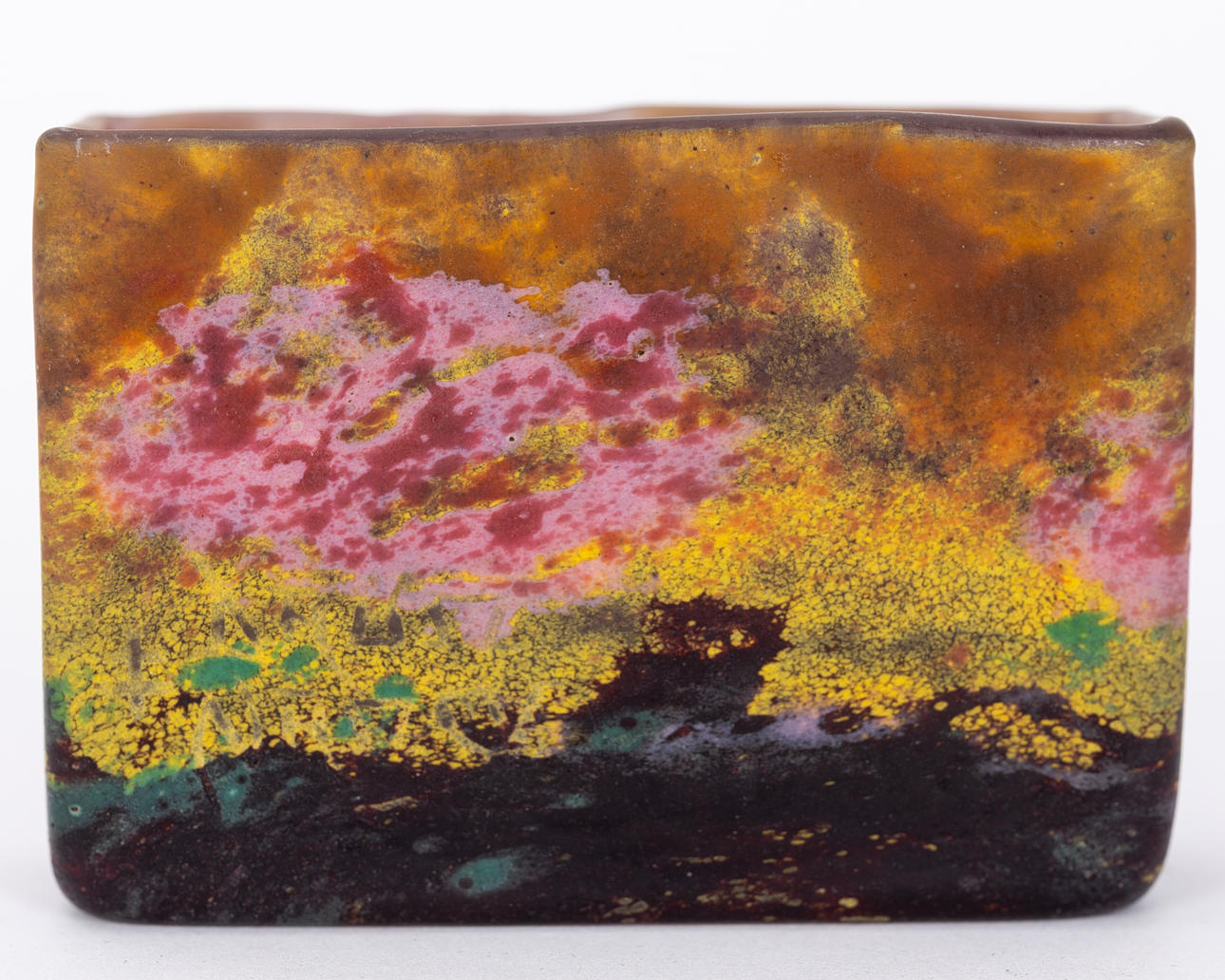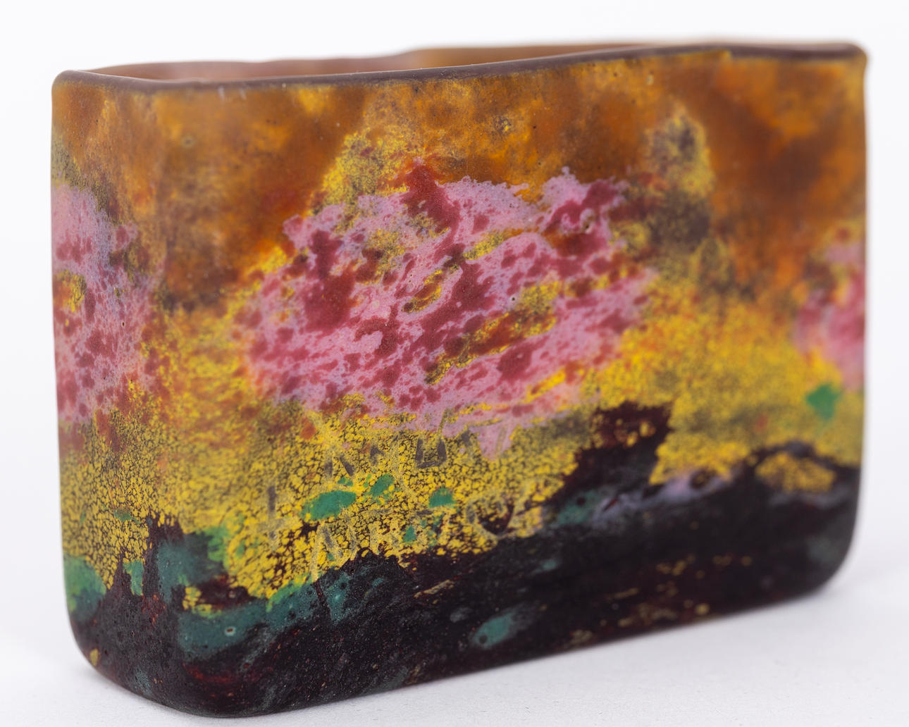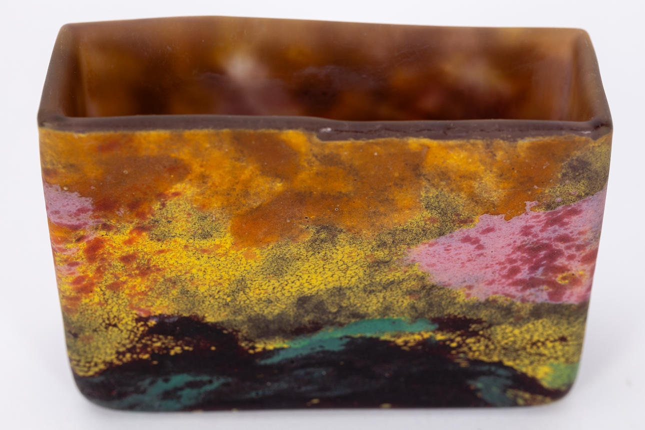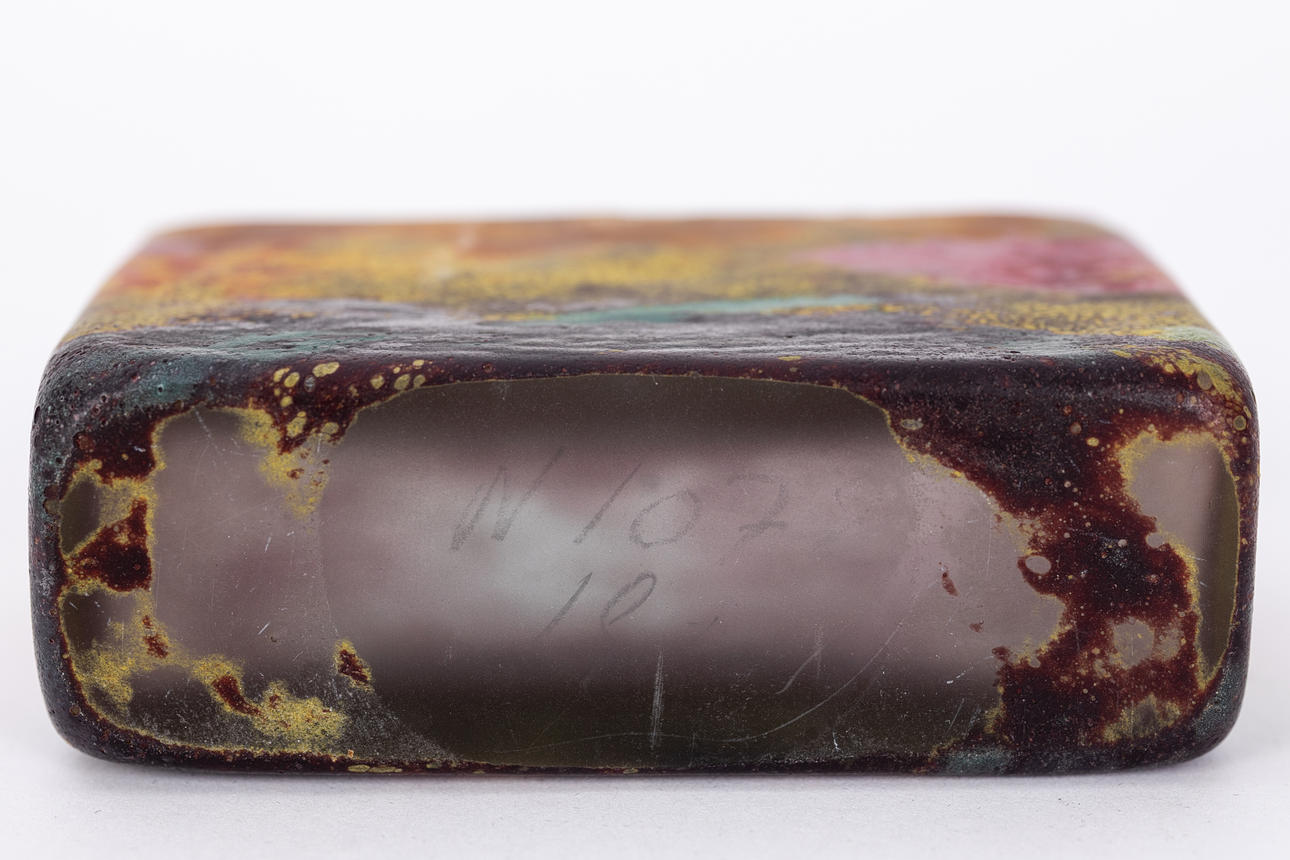 Colourless glass with polychrome powder melts, matt etched inside. Rectangle shape Company name on the wall. HxWxD: 6.5 x 9.5 x 3 cm.