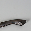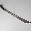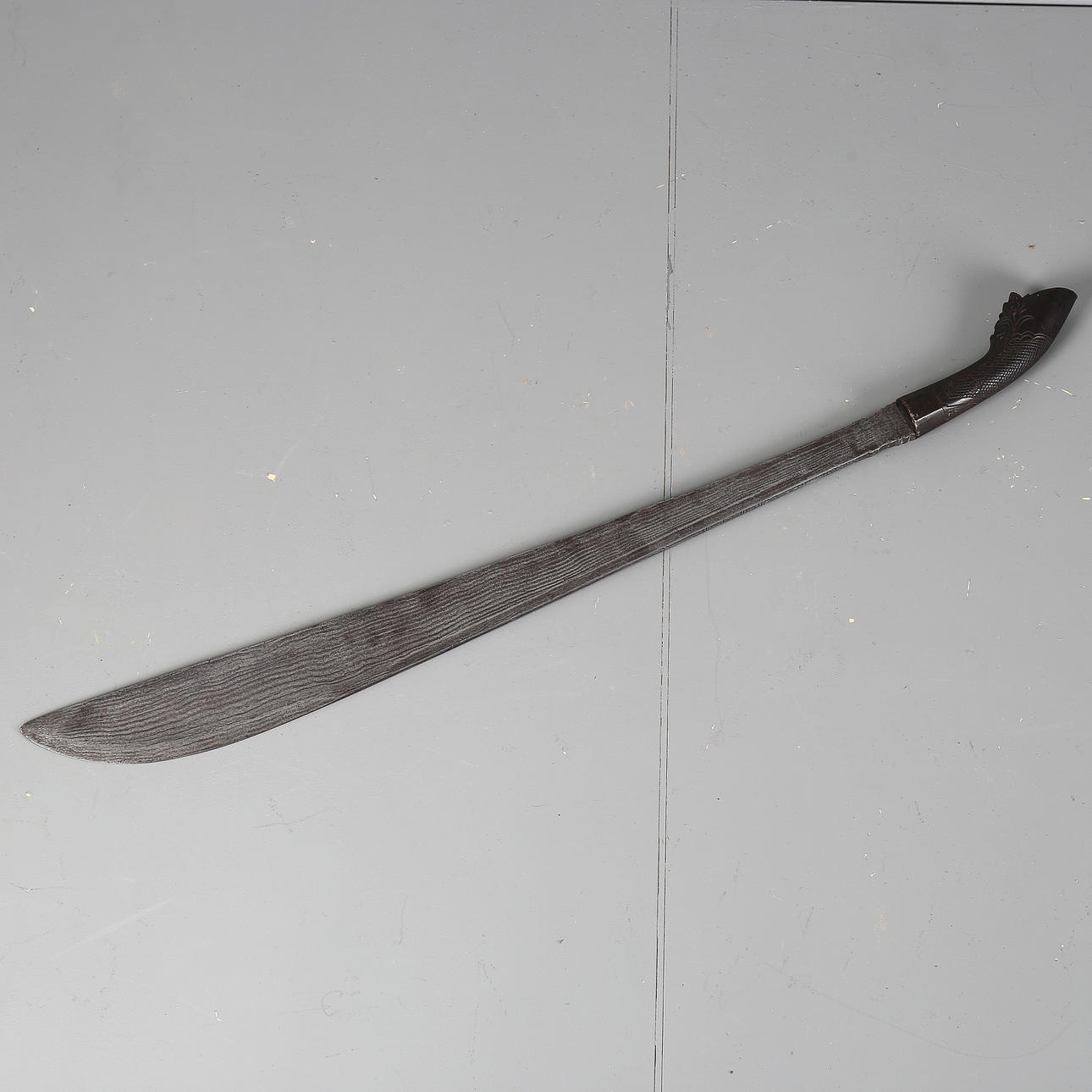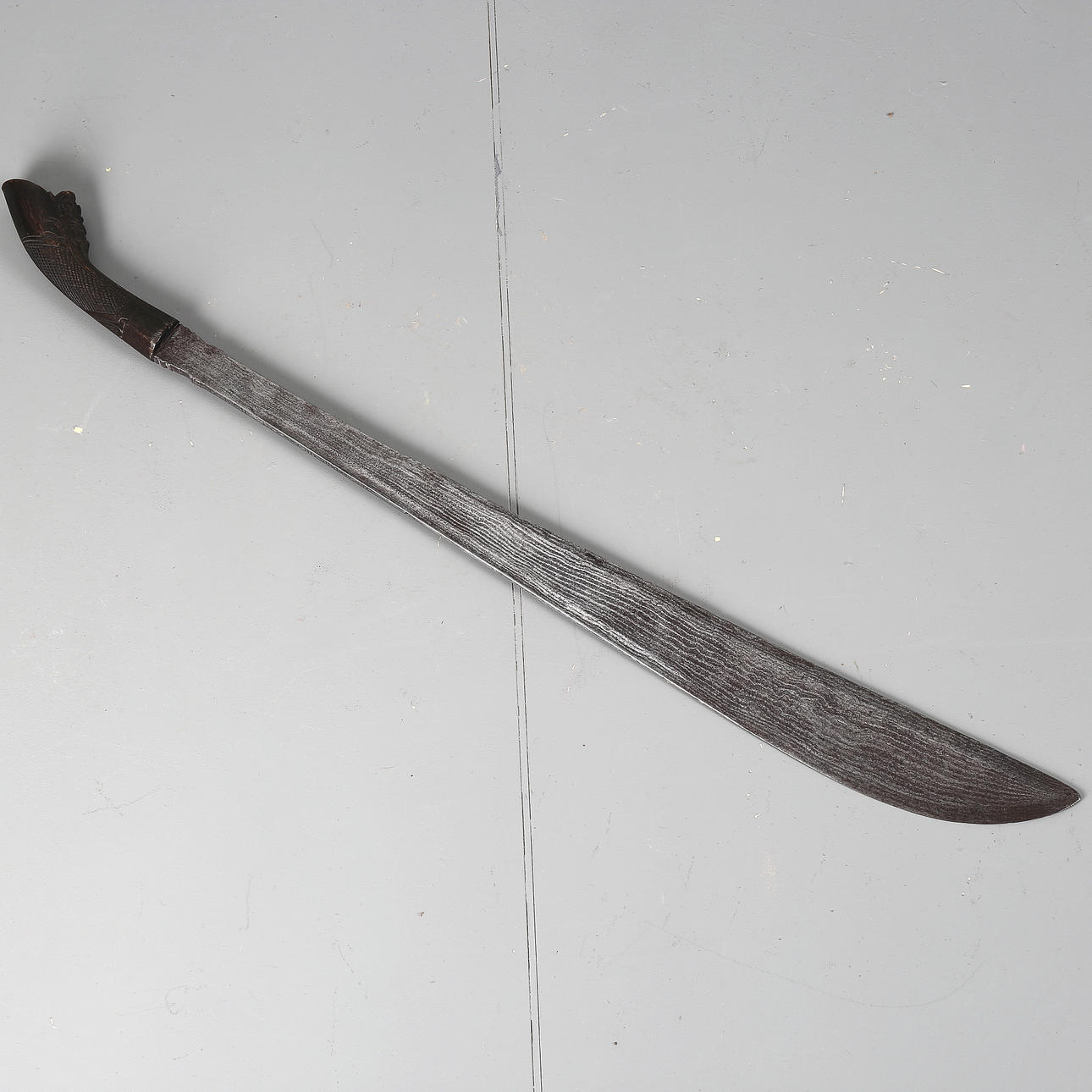 Length 78 cm, damasked blade, decorated on the back of the blade with loops, wooden handle with carved decoration.