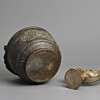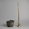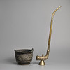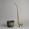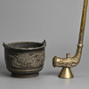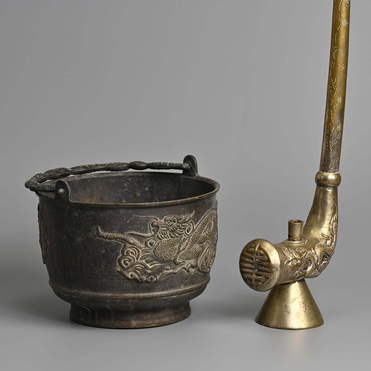 To incude a brass opium pipe decorated with dragon and phoenix in relief with a Shou medallion, stamped Made in Hong Kong to base; Together with a bronze container with handle, cast in relief with dragons. Pipe 61cm tall x 18cm x 7cm. Container 20cm x 20cm x 15cm. (2).