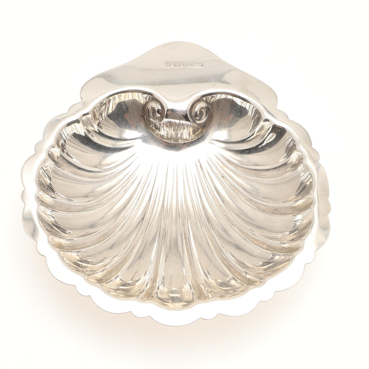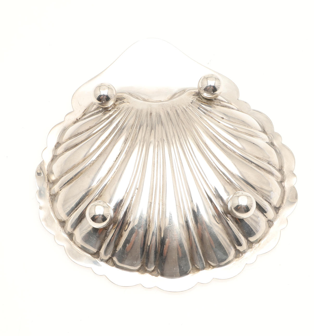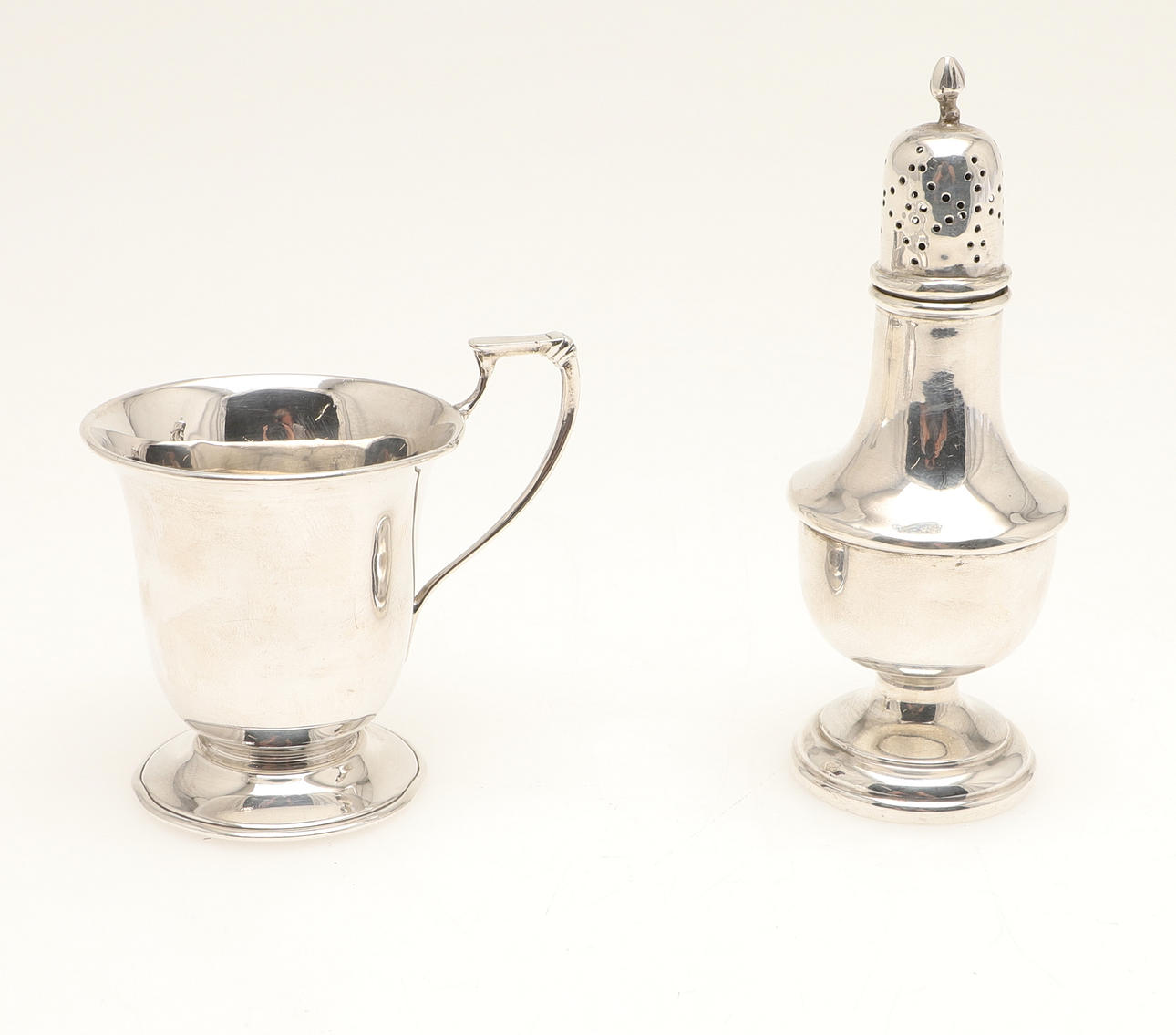 The scallop shell dish with ball feet, measuring 14cm x 12.5cm and hallmarked William Suckling Ltd, Birmingham, 1926. Together with a silver shaker and silver christening cup. Total lot weight 6.7ozt. (3).