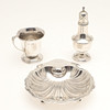 4385070. A SILVER SCALLOP SHELL DISH, SHAKER AND CHRISTENING CUP.