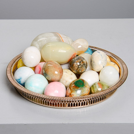 A set of 18 stone eggs, different types of stone.