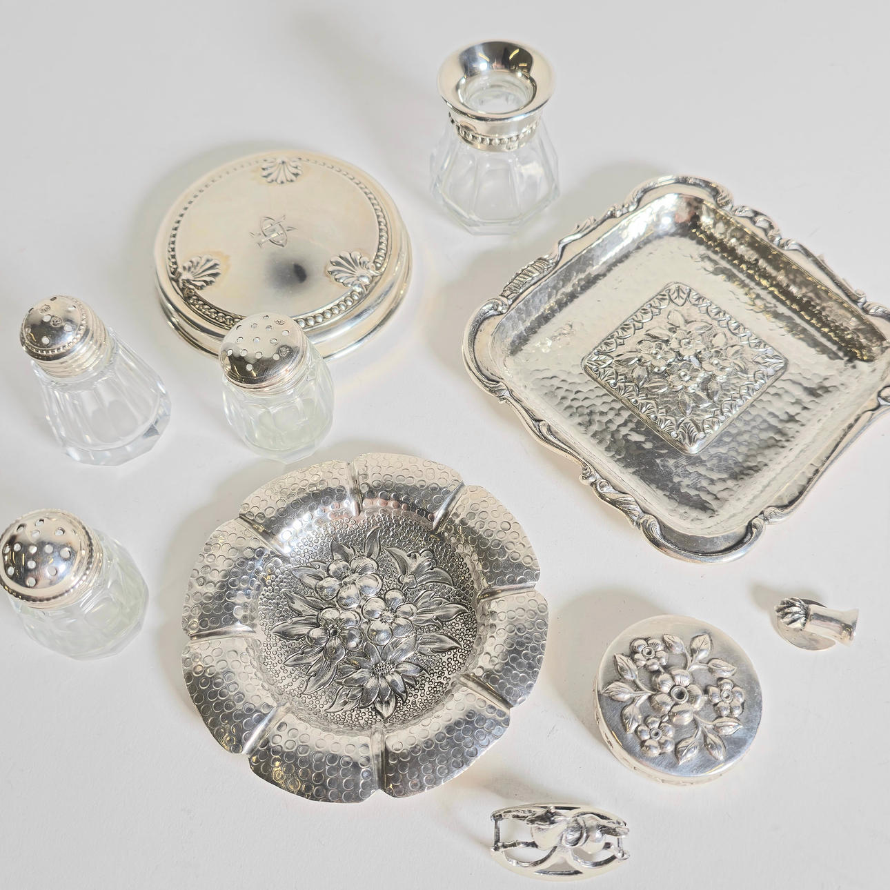 MISCELLANEOUS SILVER OBJECTS. SALT SHAKERS, PILLBOXES, TRAYS AND OTHERS.
