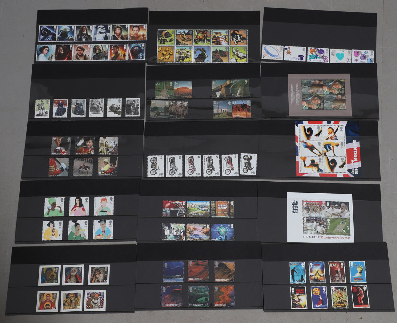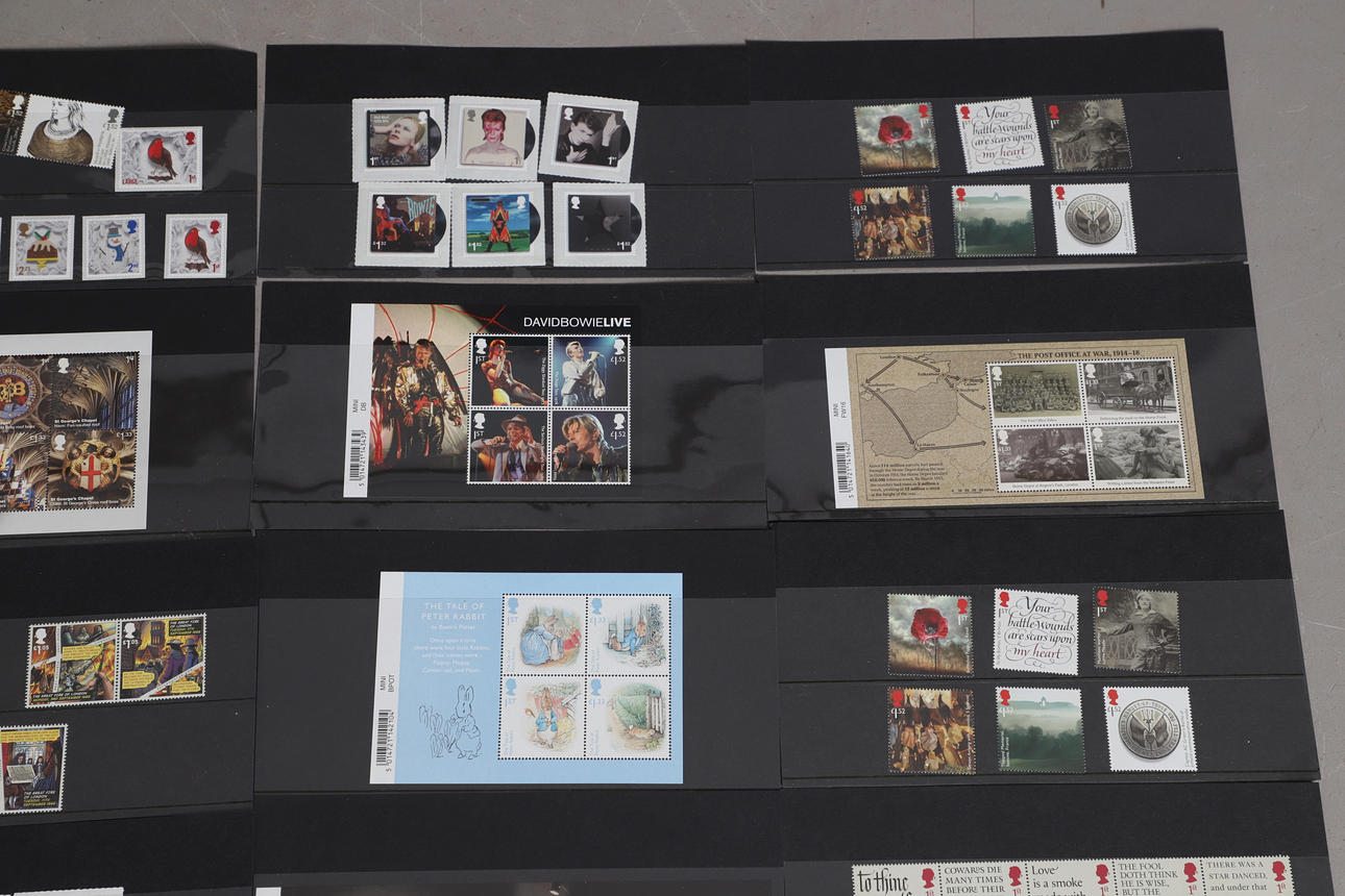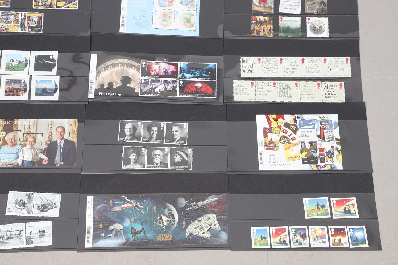 GB Commems on cards as received as perfect mint new issues from the Bureau in Edinburgh, with sets, M/S, panes of 10x1st Class etc, with a very good range from 1988-2016, having a current face value of over £2100.