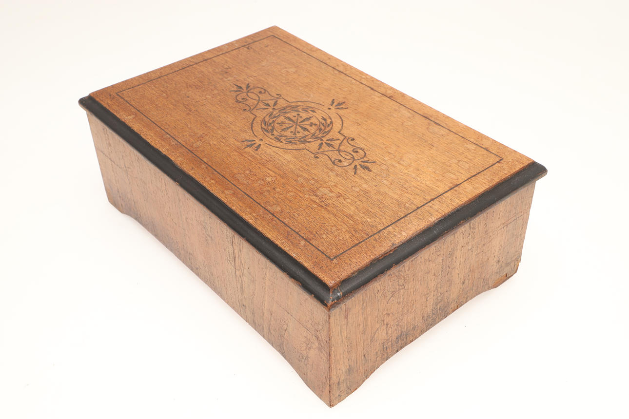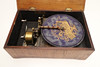 A walnut cased Orphenion, with a quanity of 7ins discs and with an attached winding handle. Case 32cms by 21cms, 11cms high.