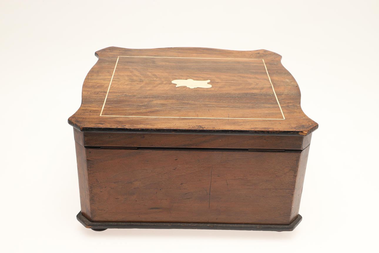 A table top polython in a walnut case, with a 8ins disc and with a winding handle to the front of the case. 27cms by 25cms, 16cms high.