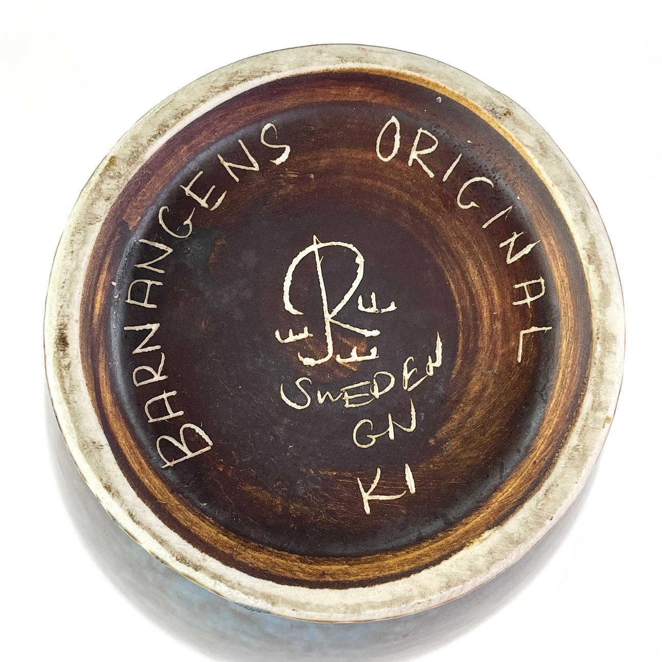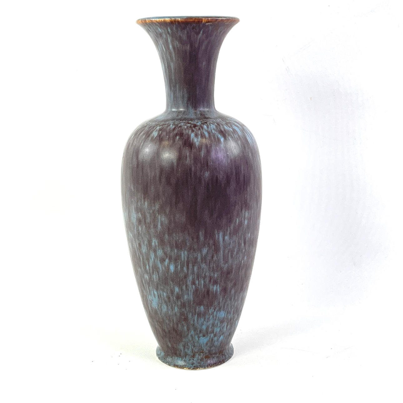 Vase in baluster-shaped stoneware, with harp fur glaze in red purple and blue. In the model “KI”. Monogram signed underneath and marked “Barnängens originals”.