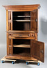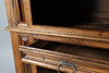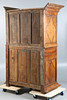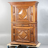 Having geometric panelled doors, the upper section enclosing shelves, fitted single drawer to the mid section and further door below, raised on bun feet, 207cm high, 140cm wide, 72cm deep.