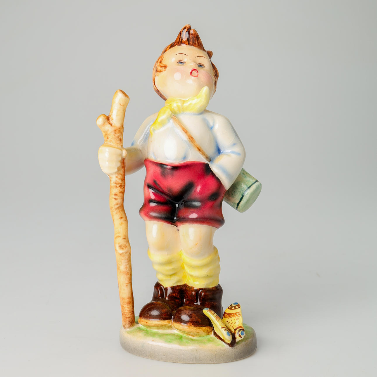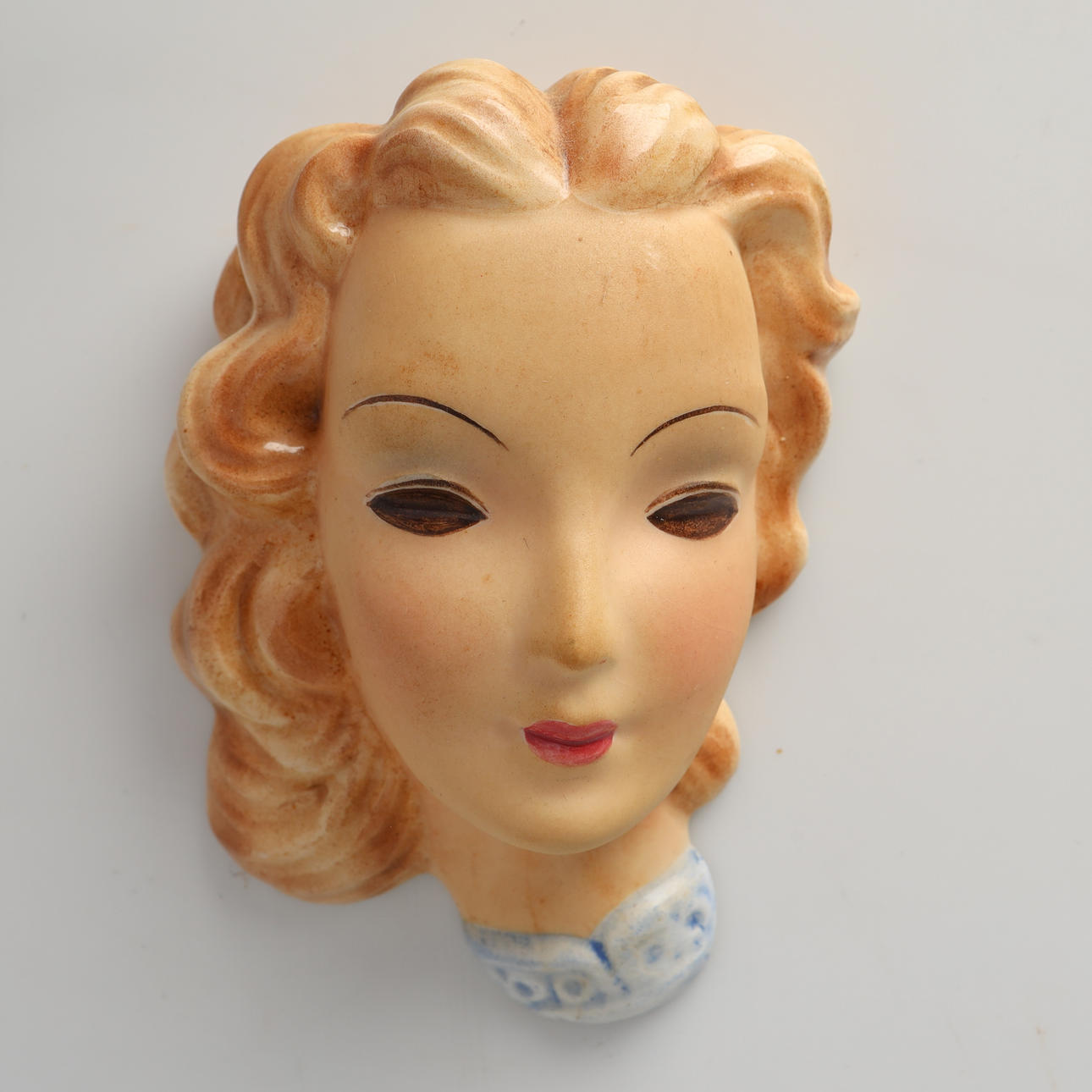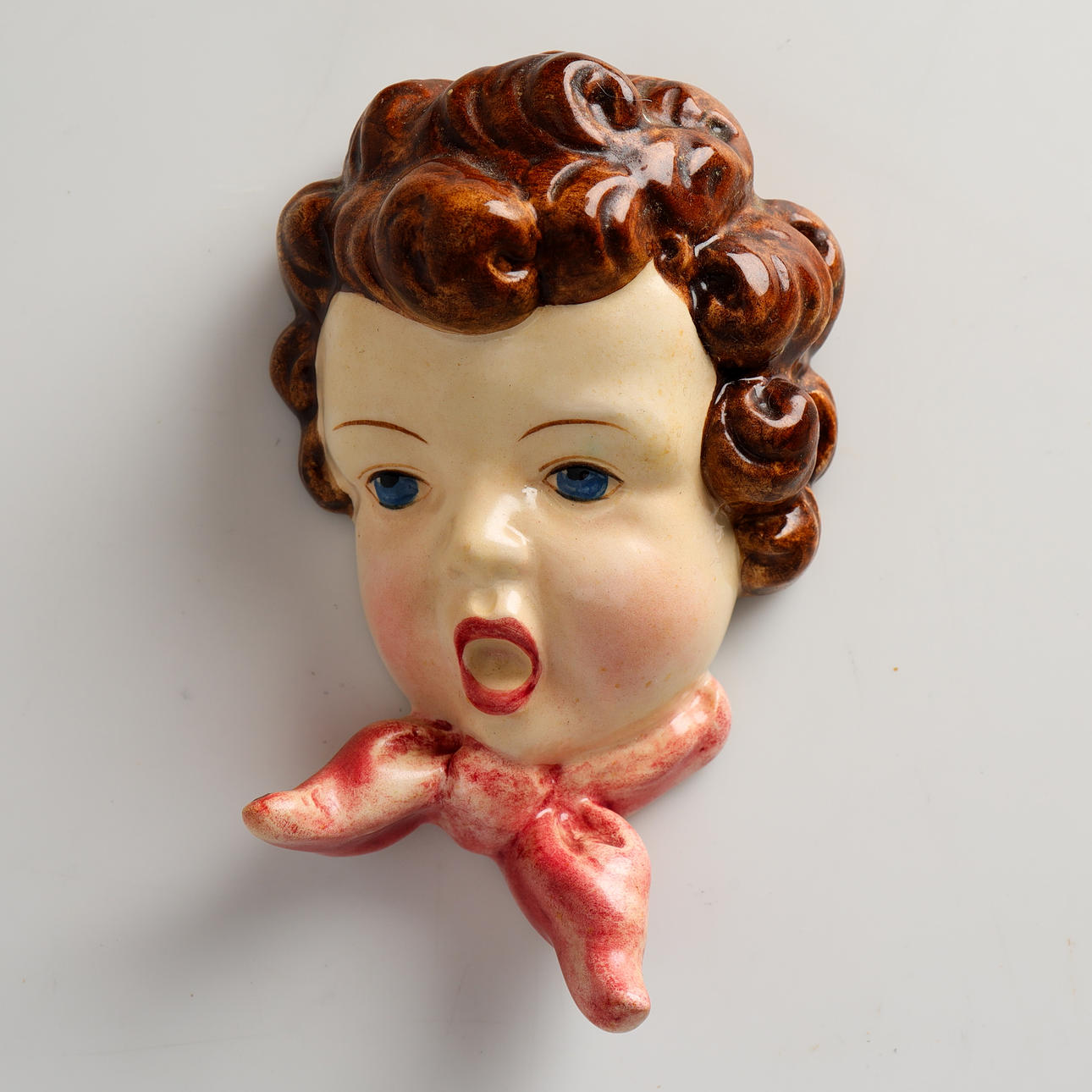 Goldscheider Wien, four small earthenware figures consisting of Karl Sailer standing boy with butterfly 'Botaniker' nr.8836/22/14 h.16.5 cm as well as three small faces for wall hanging; boy with hat, child with scarf and 'Pinup' h. from 7.5 to 11 cm. 1930-40s.
