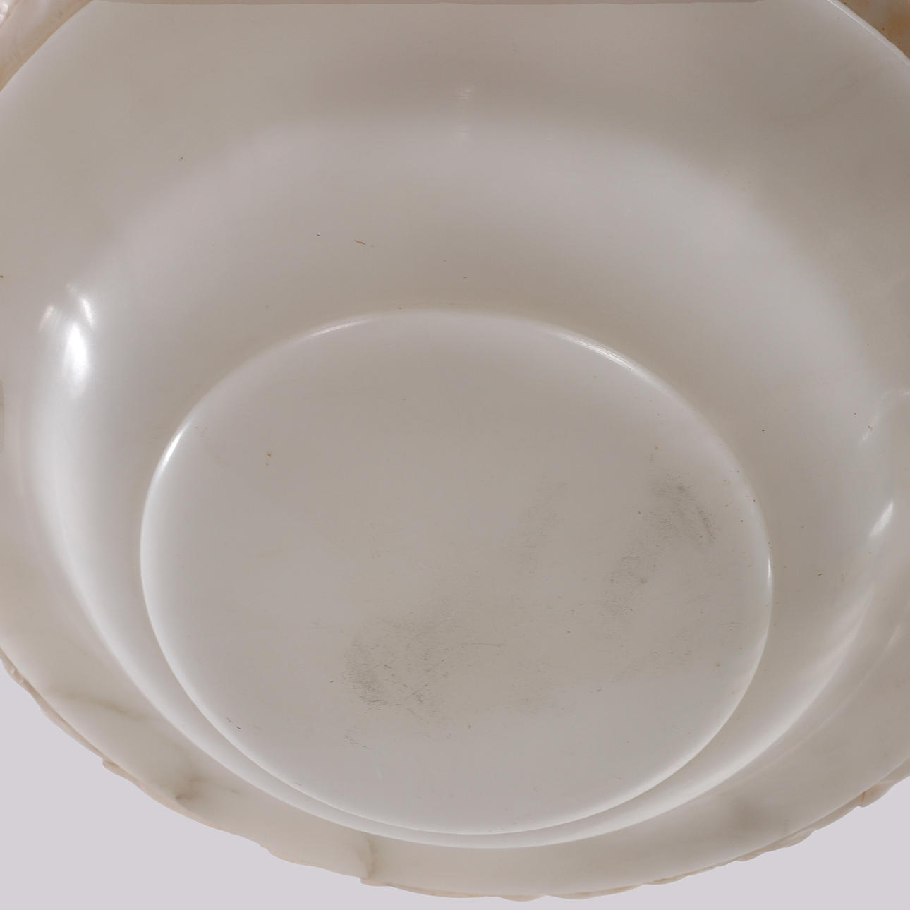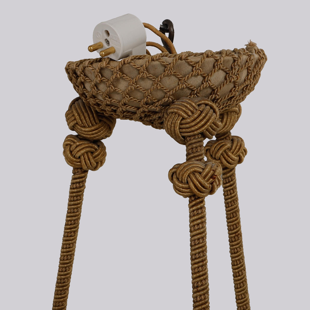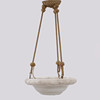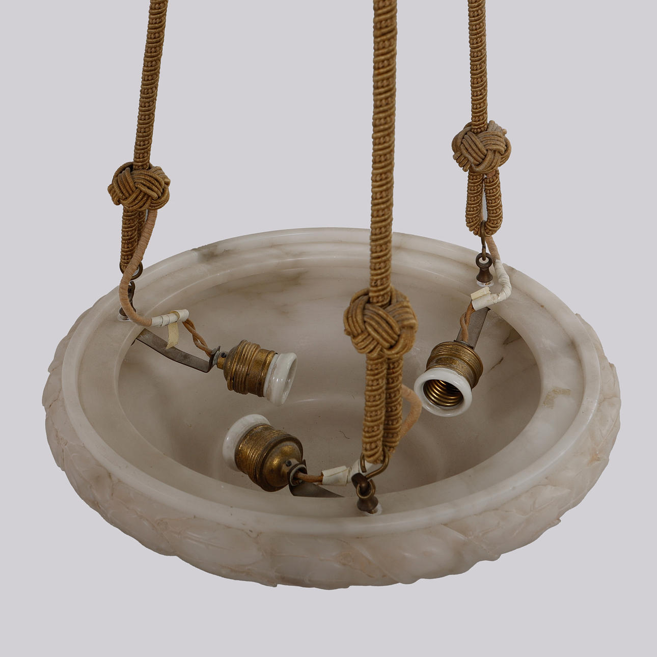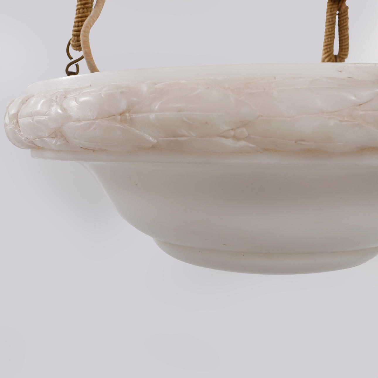 Cup in alabaster with laurel decor. Laced cables and ceiling cup. Diameter about 39, height about 70 cm including cup.