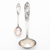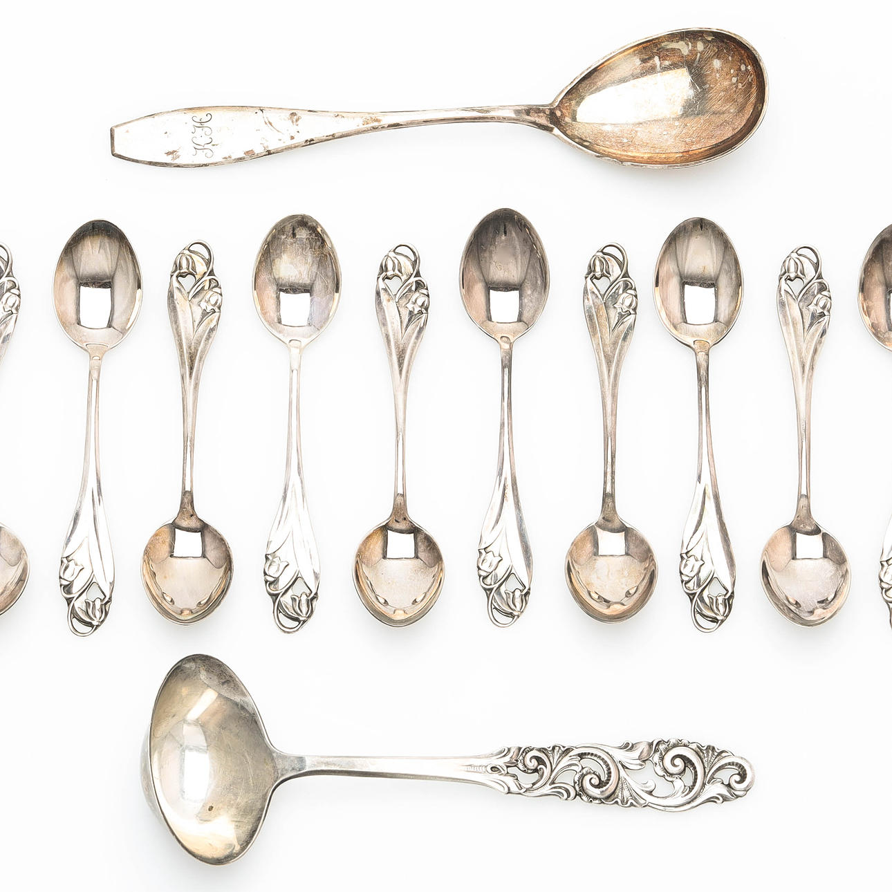 13 spoons, length about 11cm. 1 ladle, length 15cm, “Telemark”, Norway. 1 spoon, length approx. 17cm, engraving. Total weight 207 grams.