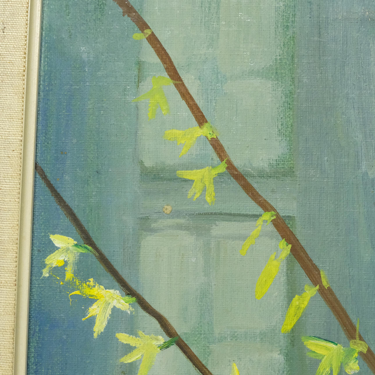 Frame with surface wear. Minor color cracklings. Canvas with dent. Stains.