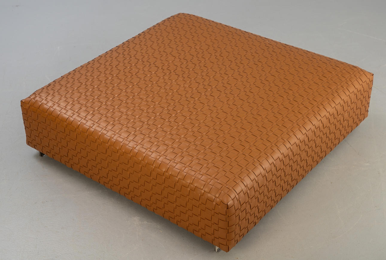 Steel base, tobacco brown core leather cover. cca H. 34 cm x W 120 cm x 120 cm.