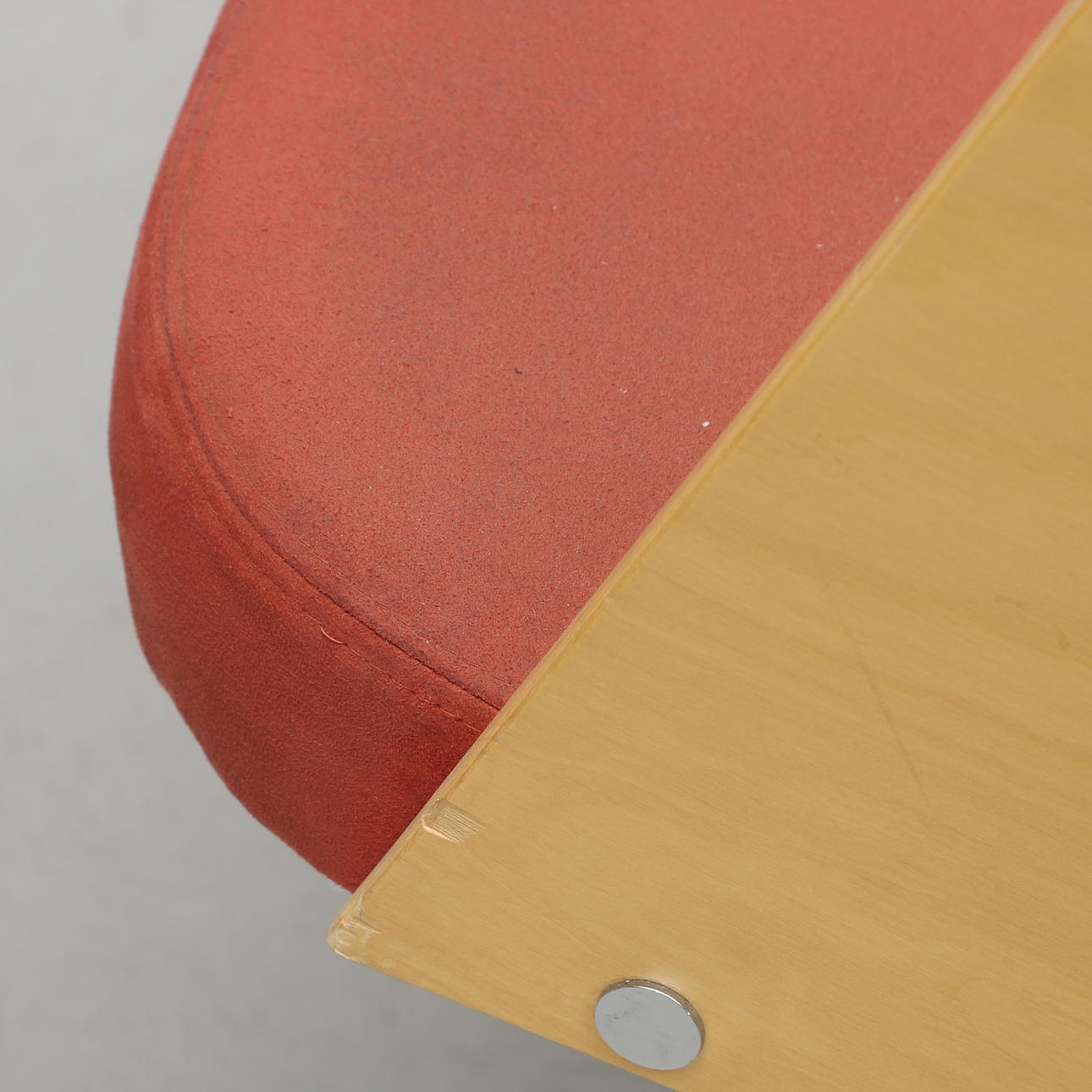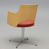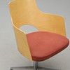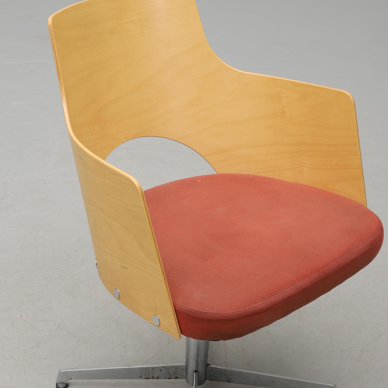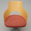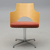 Arched back in molded birch, upholstered seat upholstered in rust-red alcantara. Spinnable foot. Width 55, depth 58, height 80, seat height 46 cm.
