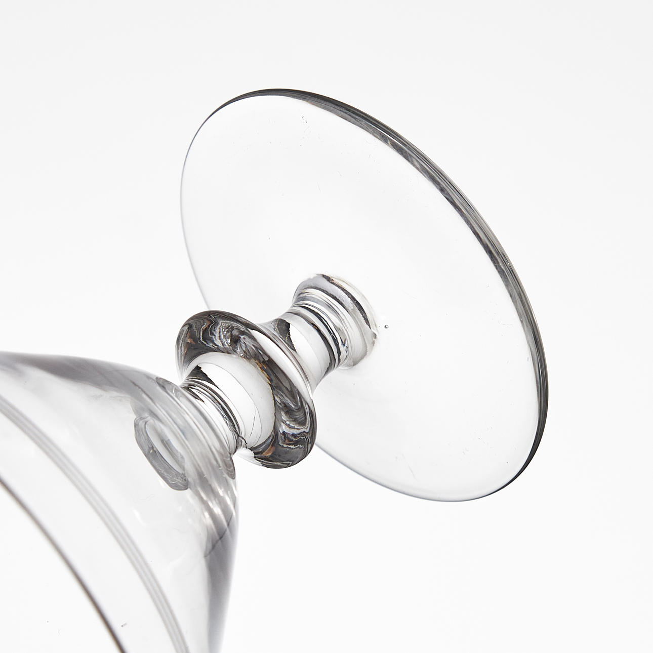 Normal wear and tear, an accompanying red wine glass with minor chips, ditto sherry foottag.