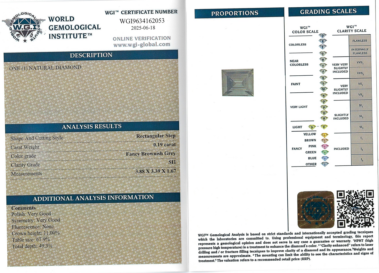 An unmounted rectangular step cut fancy brownish grey diamond. Weight: 0.19ct. Clarity: SI1. With WGI certificate.