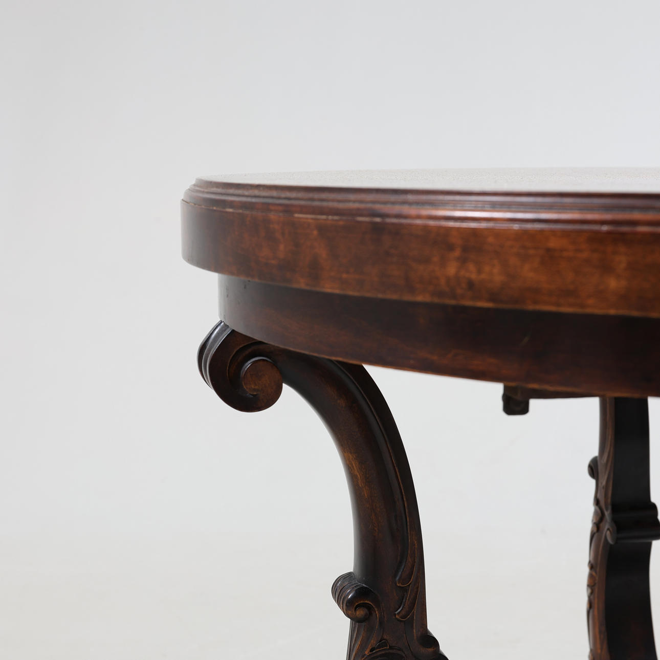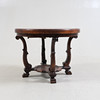 Stained wood. Cut decor. Linked leg stand with rattan.