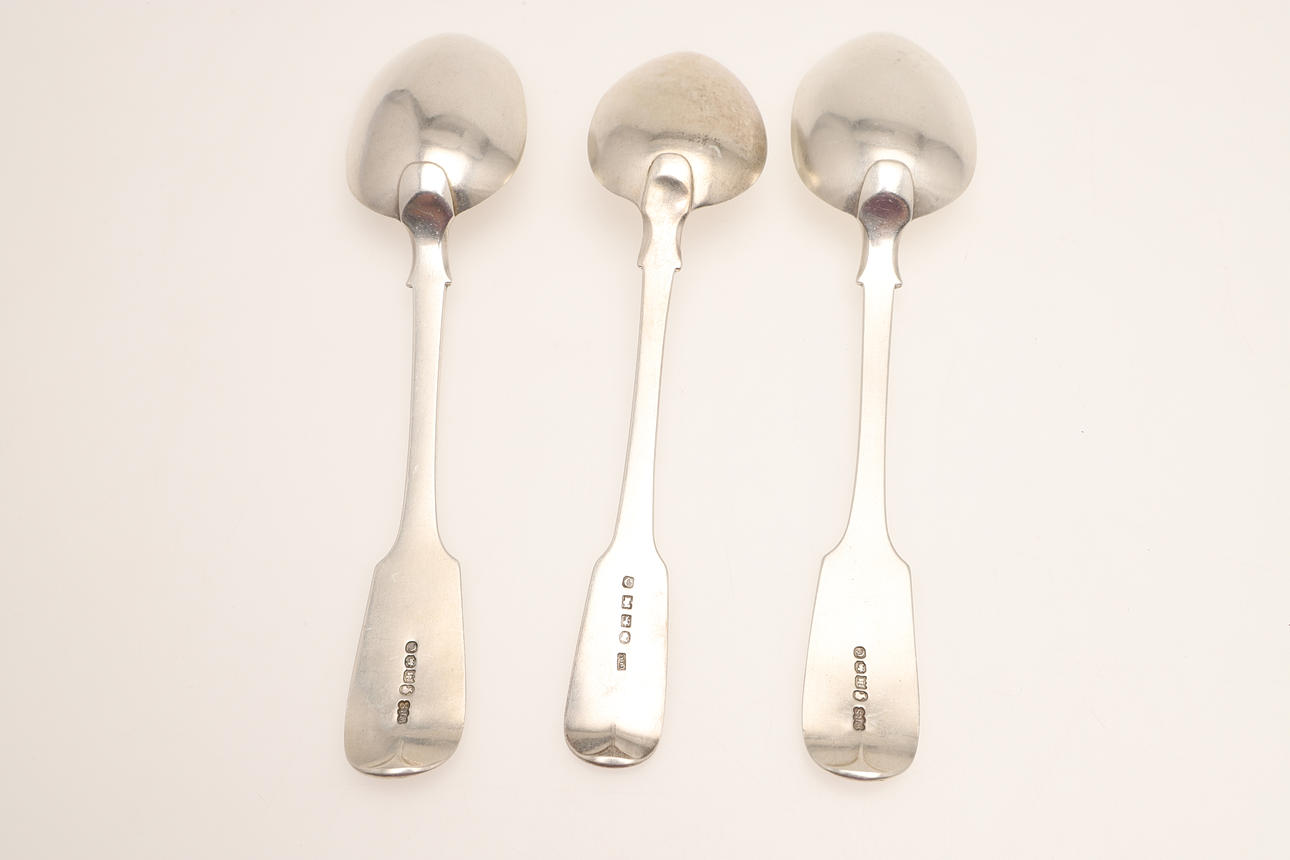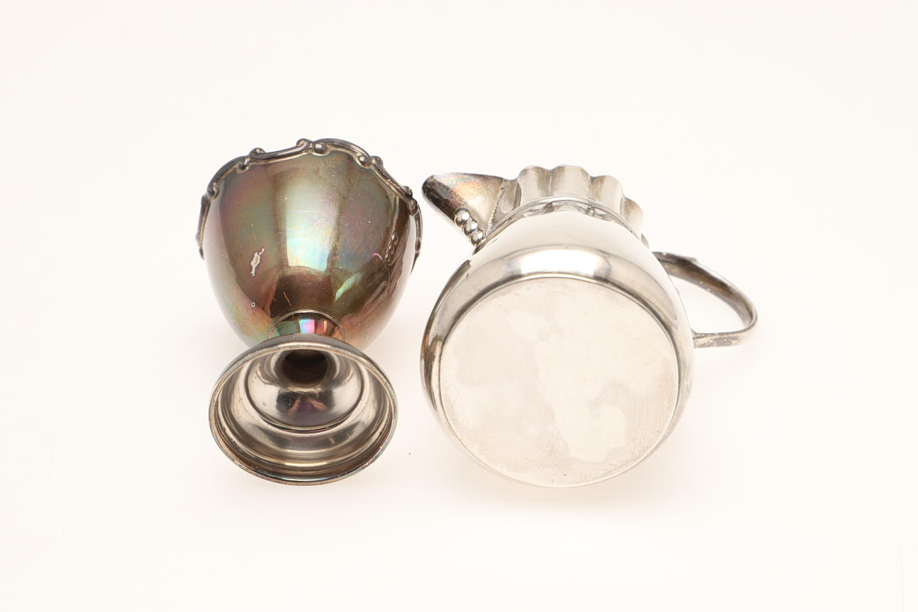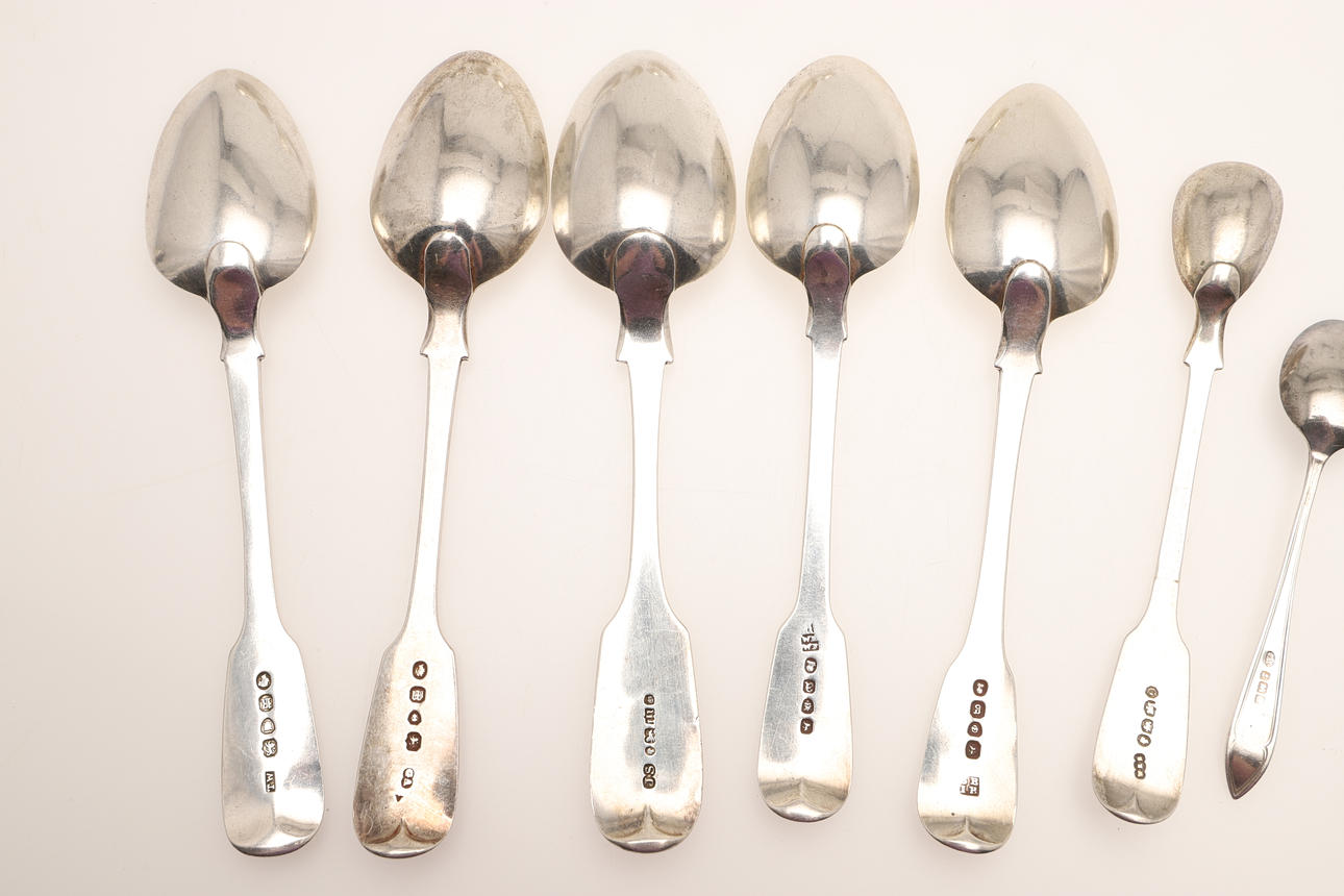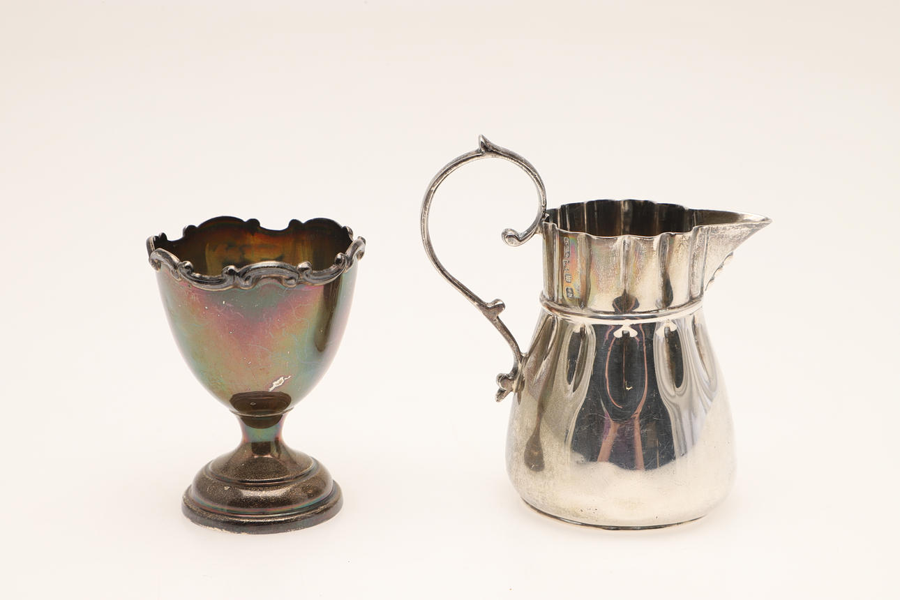 A mixed lot including a small silver milk jug (Birmingham 1896, 8cms high), three silver table spoons and two other spoons hallmarked in Exeter (1839 and other dates), other silver spoons and an egg cup. Approx 21ozs.
