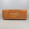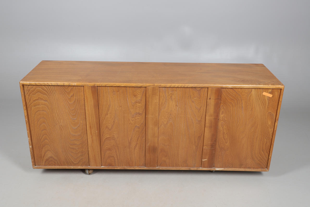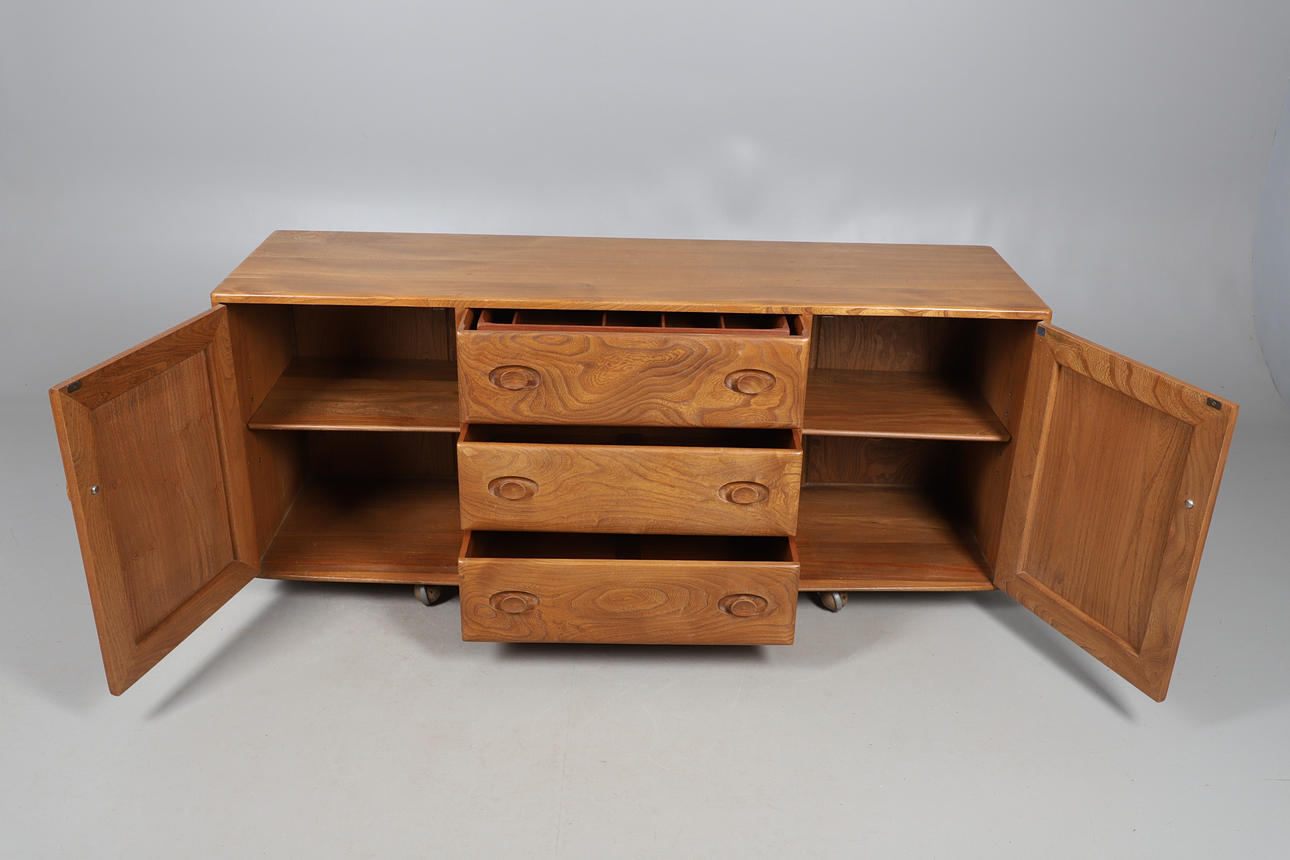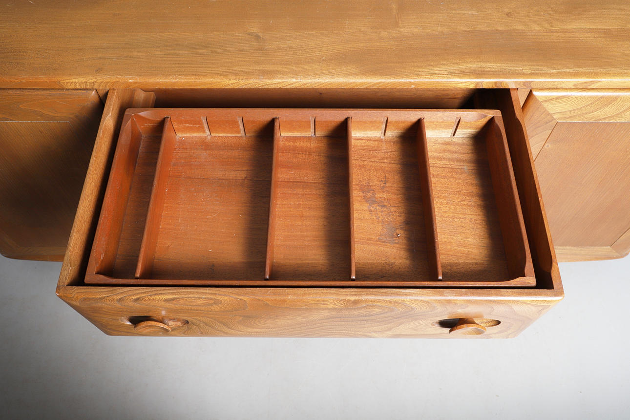 A vintage elm sideboard, with three central drawers including cutlery drawer, flanked by cupboards on each side with a single shelf. Model no 455. 154cms long, 68cms high, 43cms deep.