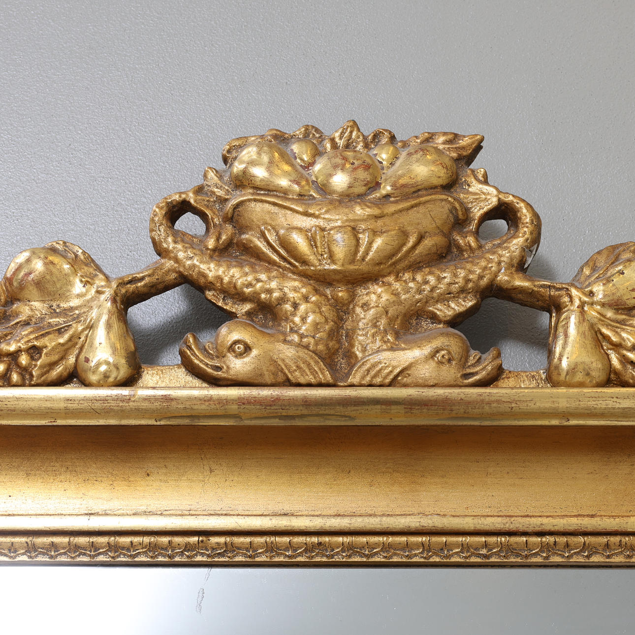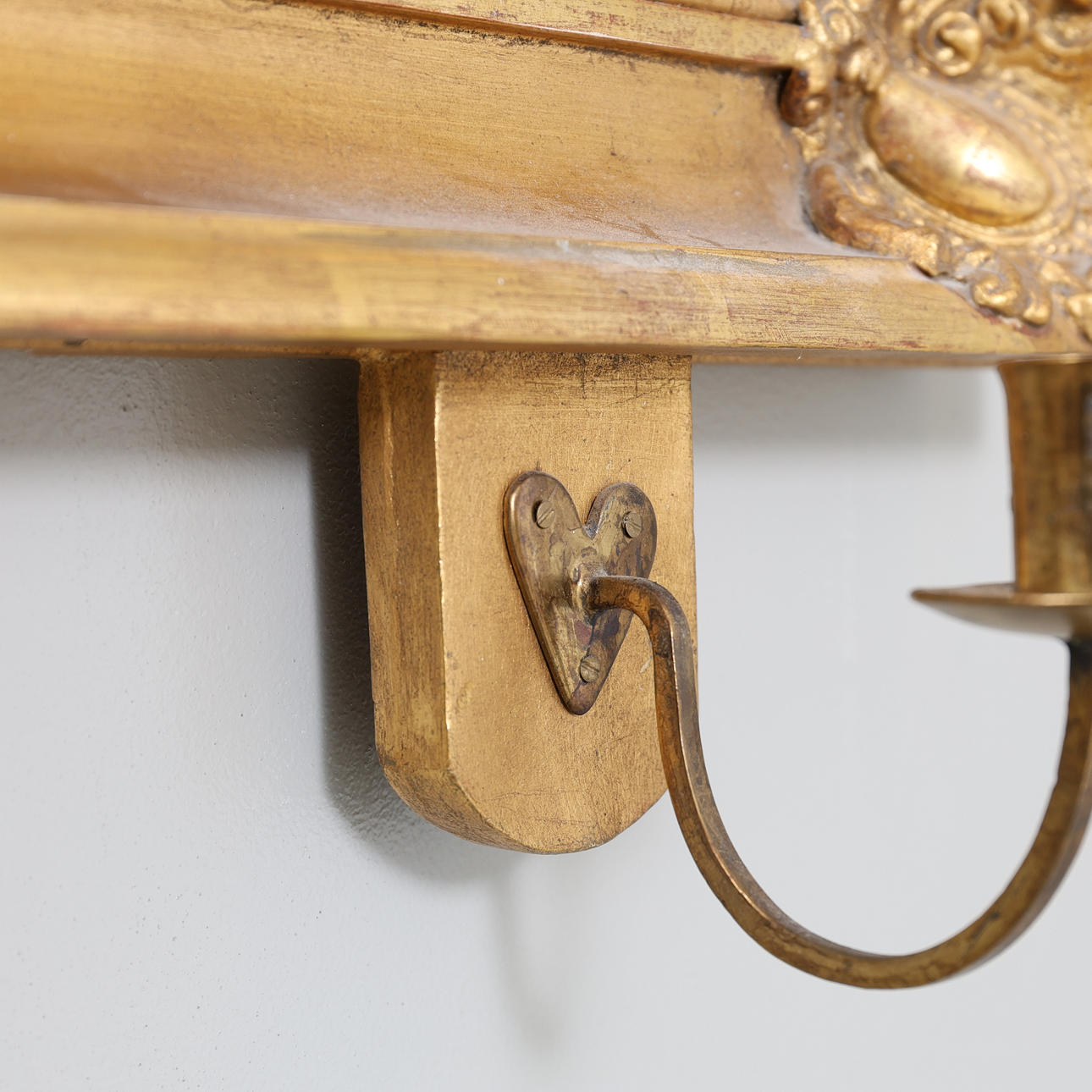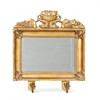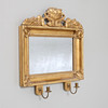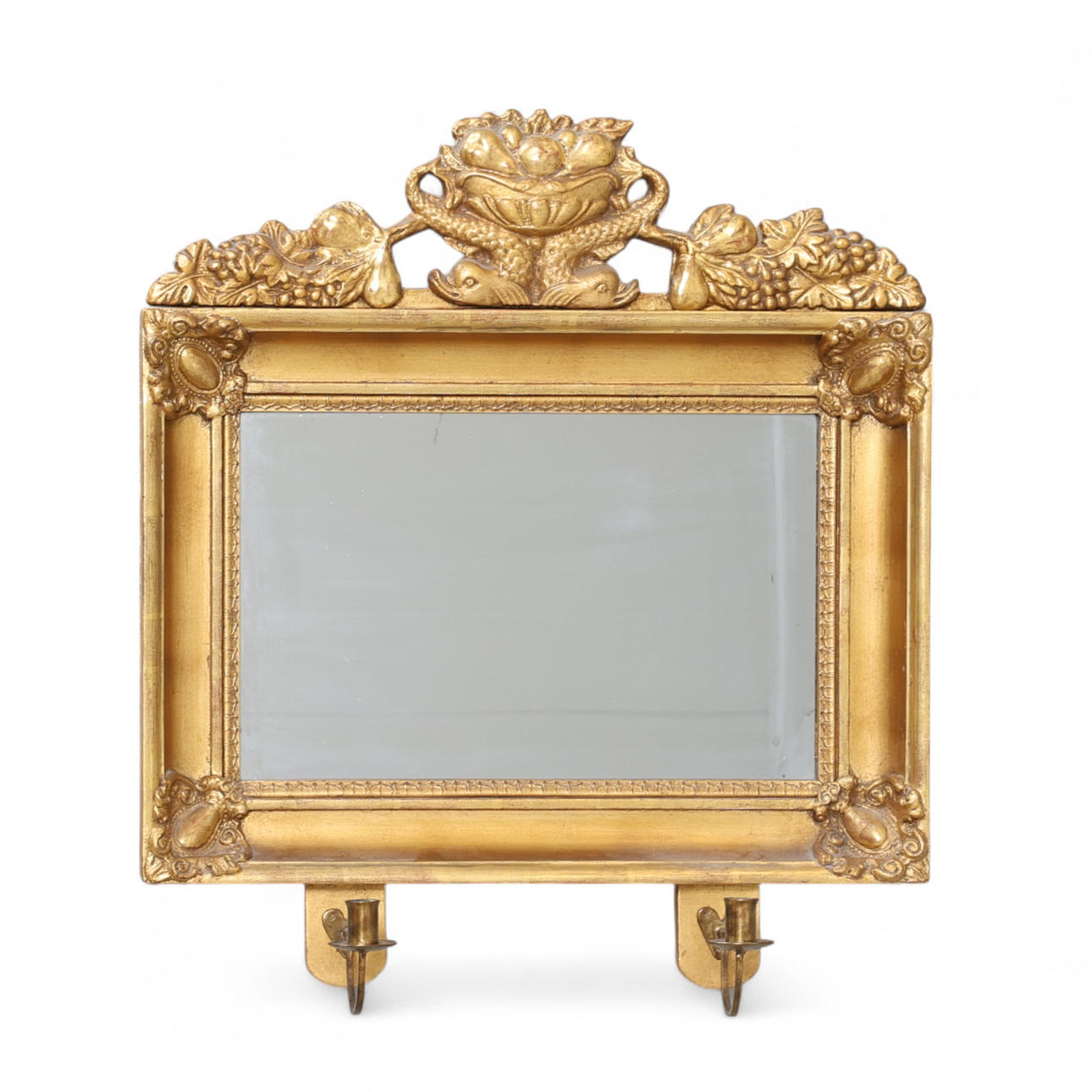 Mirror glass slightly worn, crown with repair and loss, one candle holder with crack.
