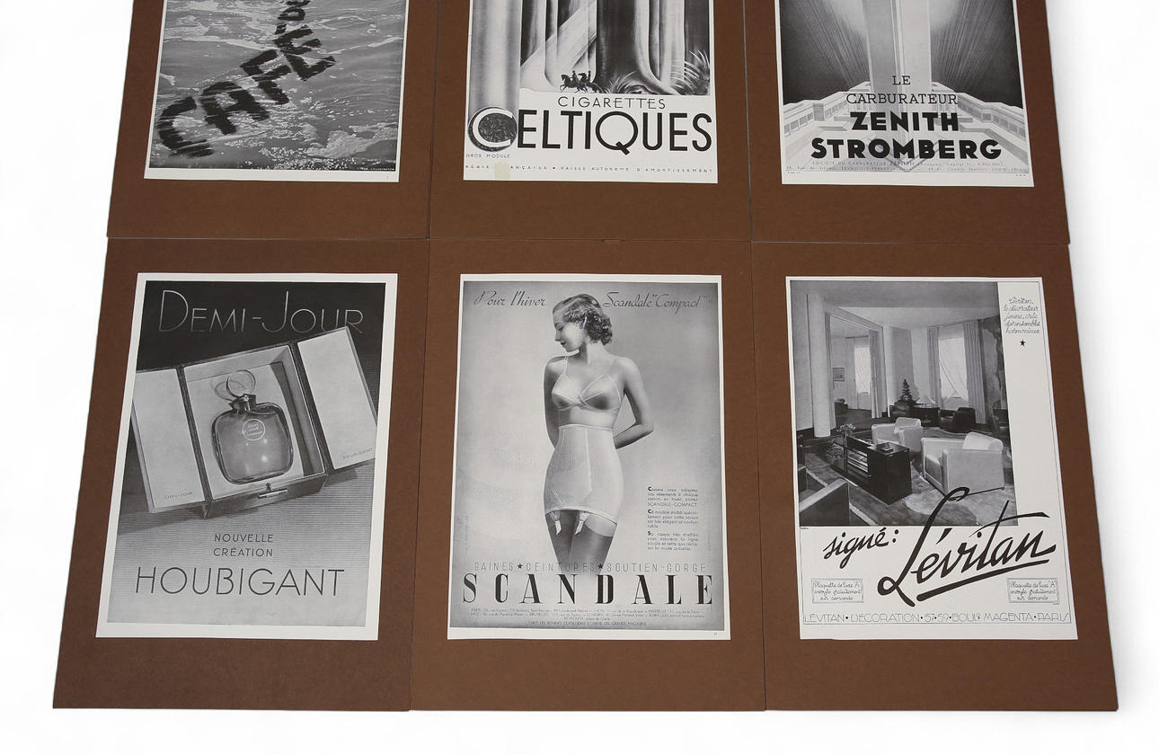 4391072. NEWSPAPER CLIPS inserted in brown passepartout depicting advertisements for various perfumes, coffee, underwear etc., 9 pieces.