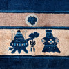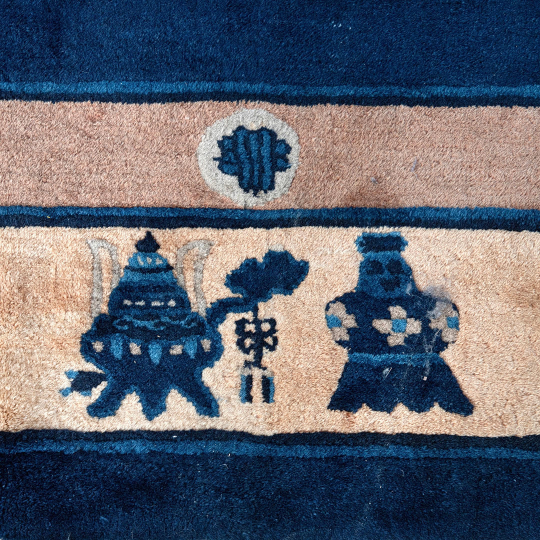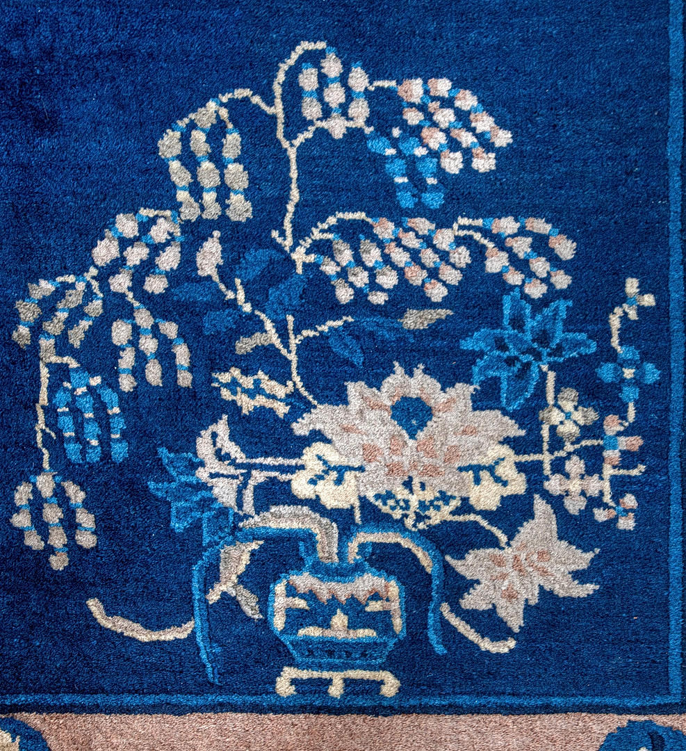 wool on cotton Collectible vases with bluebells and peonies on a royal blue peloton. The auspicious symbols and flower branches in the beige main border.