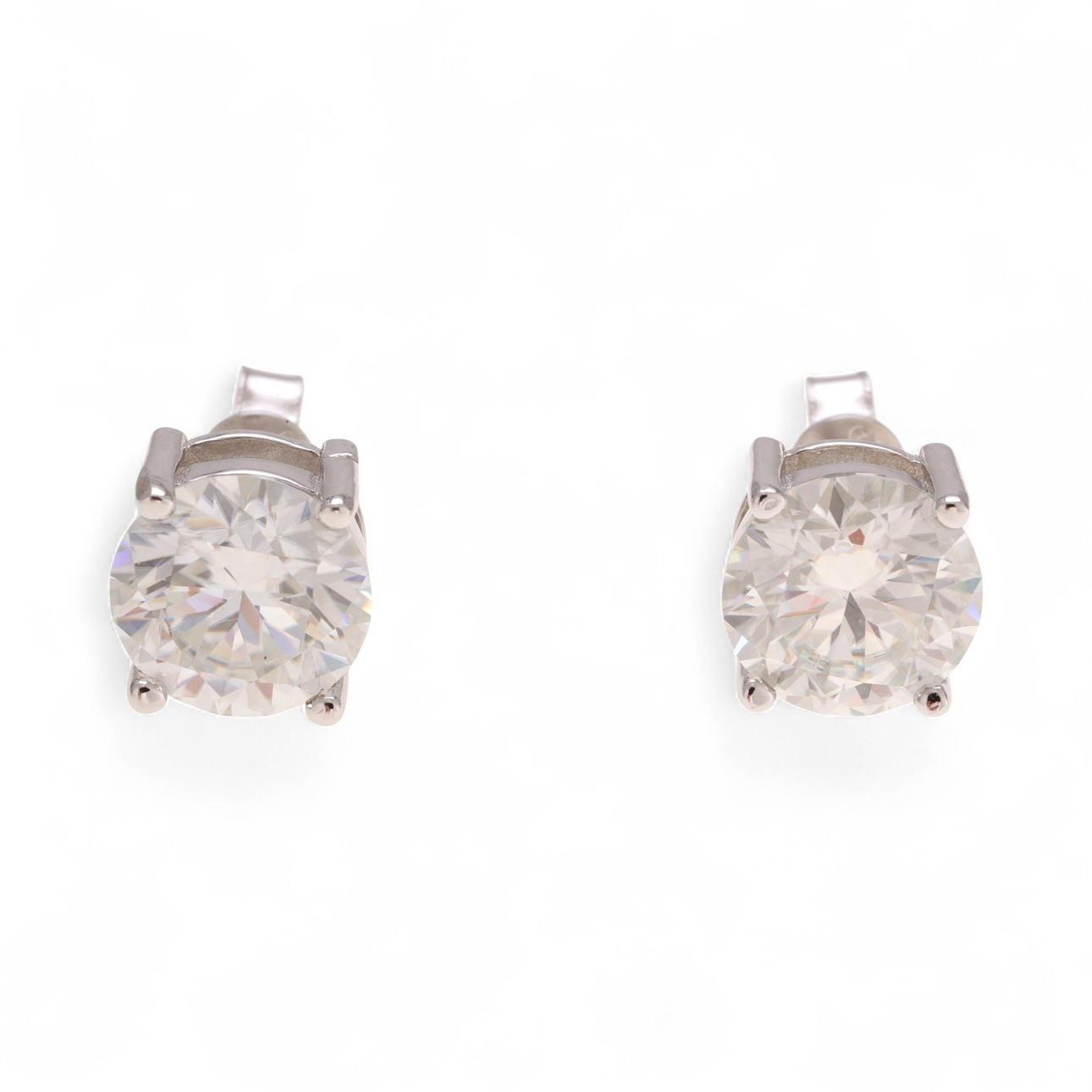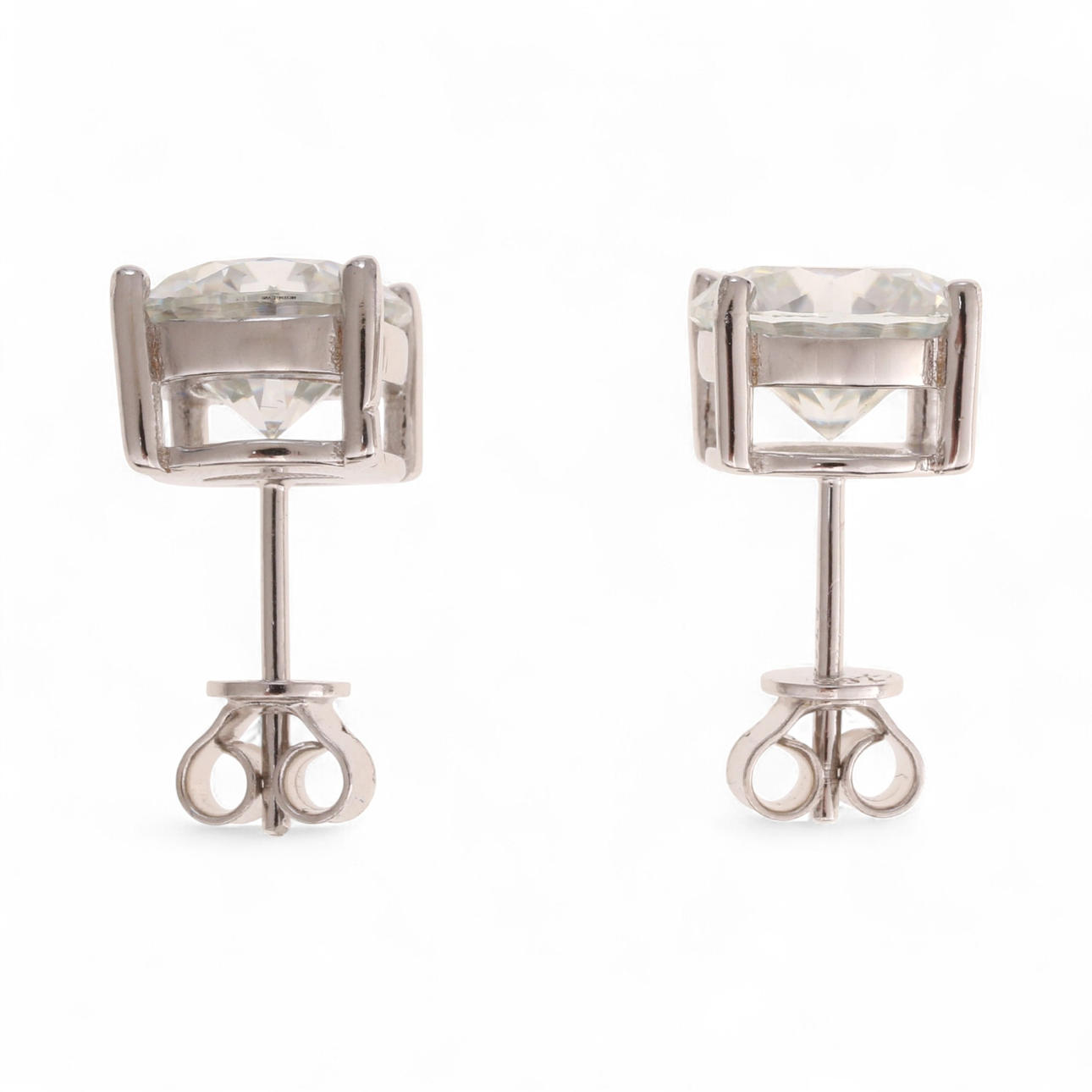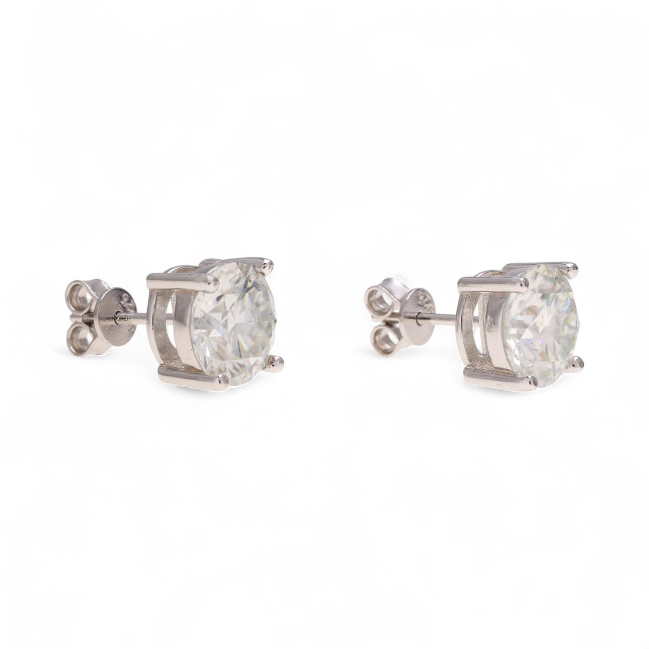 With certificates by Gemological Research Academy (GRA), No. 219633289 and No. 219633290, attesting that they are two round cut moissanites, 3 cts, D colour and VVS1 clarity each.