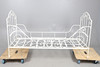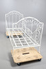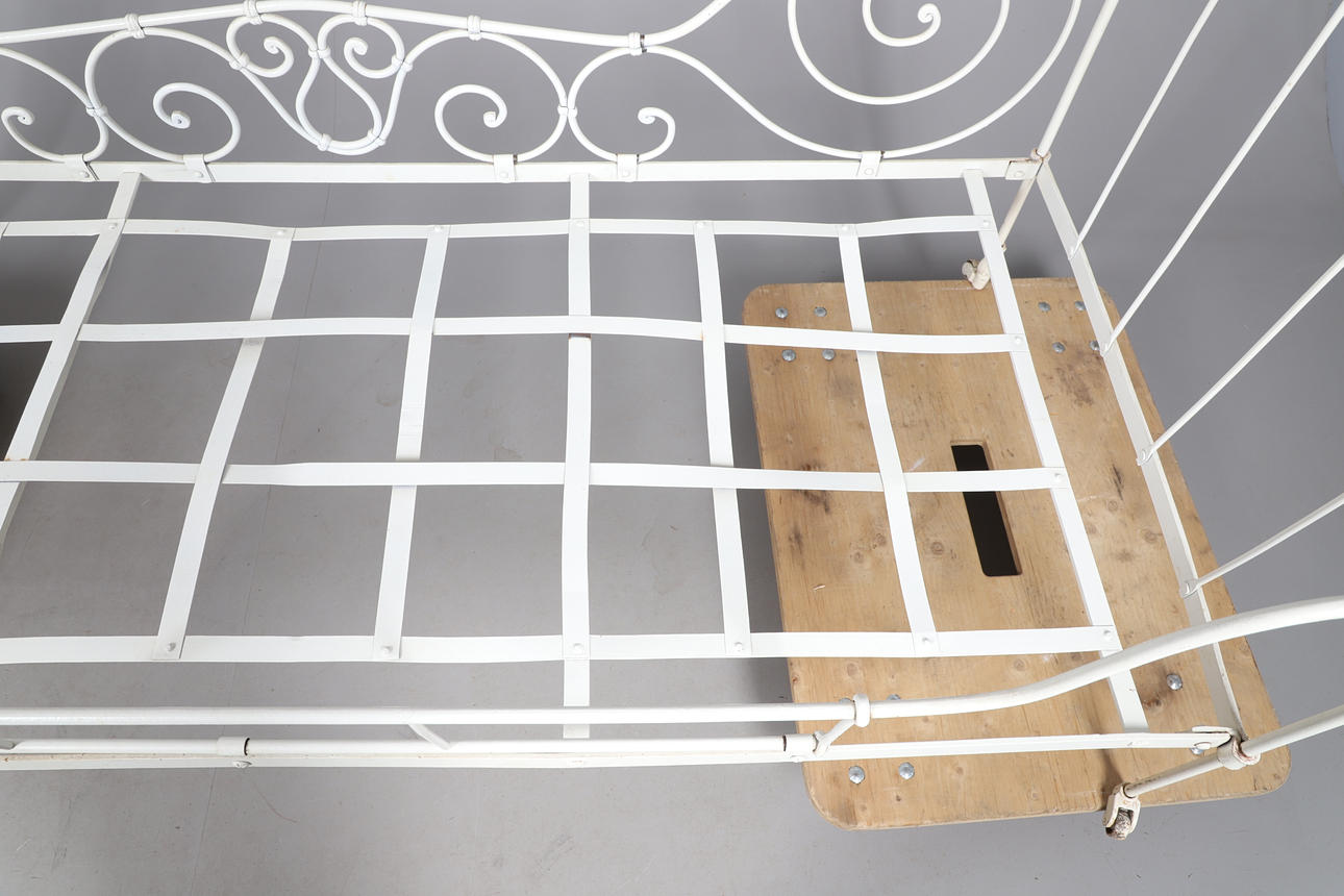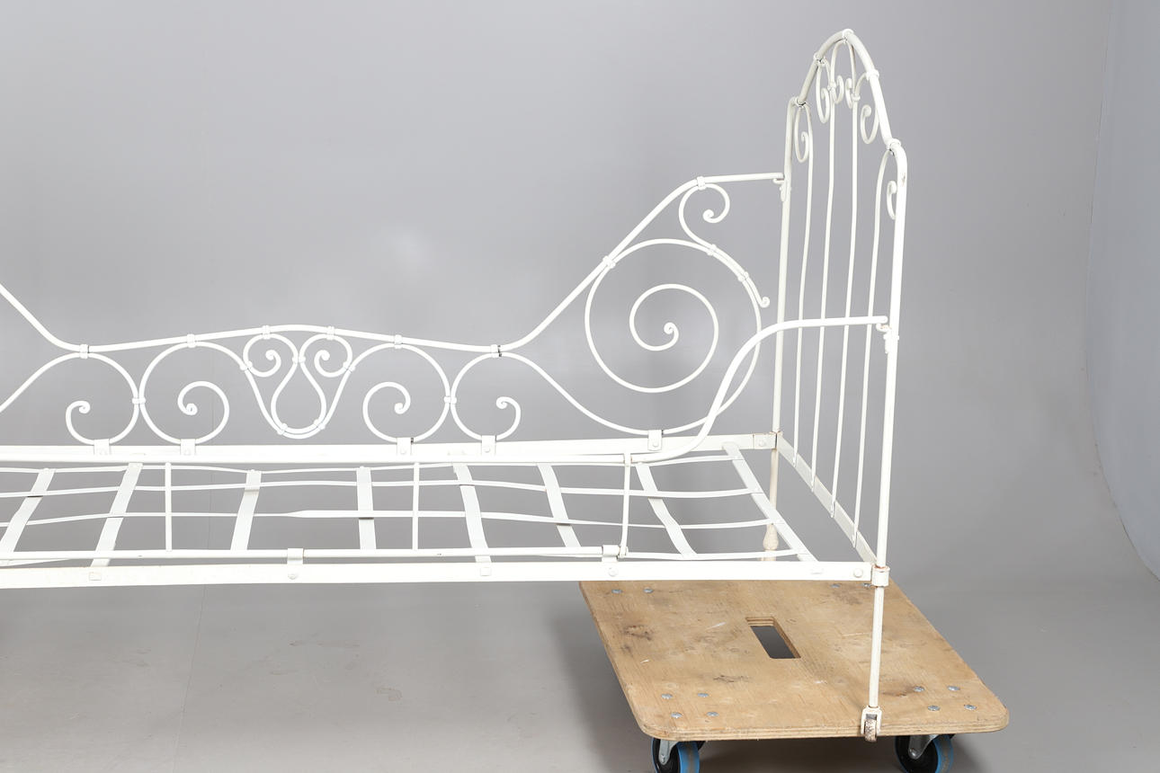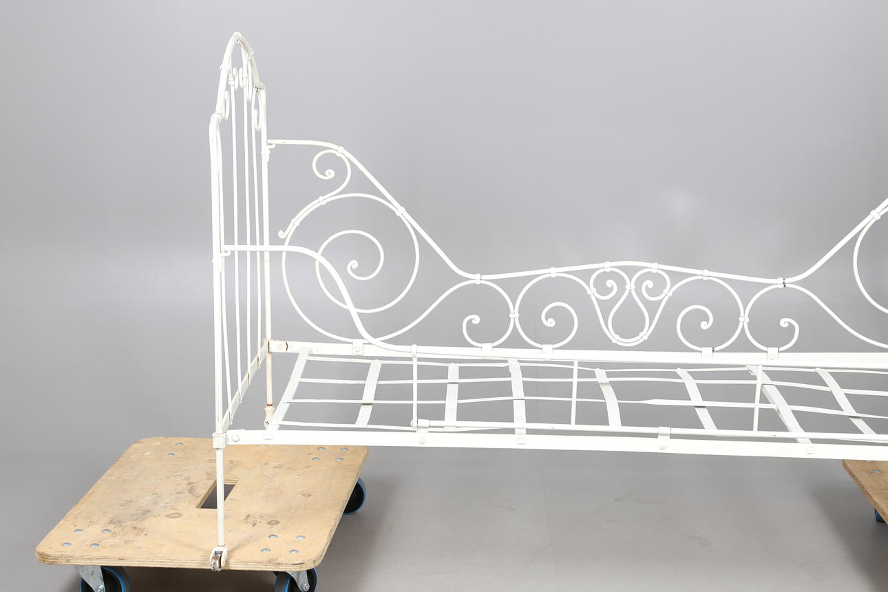 The day bed of decorative design, on four metal castors, can be dismantled. Height 106cm, length 182cm, width 80cm.