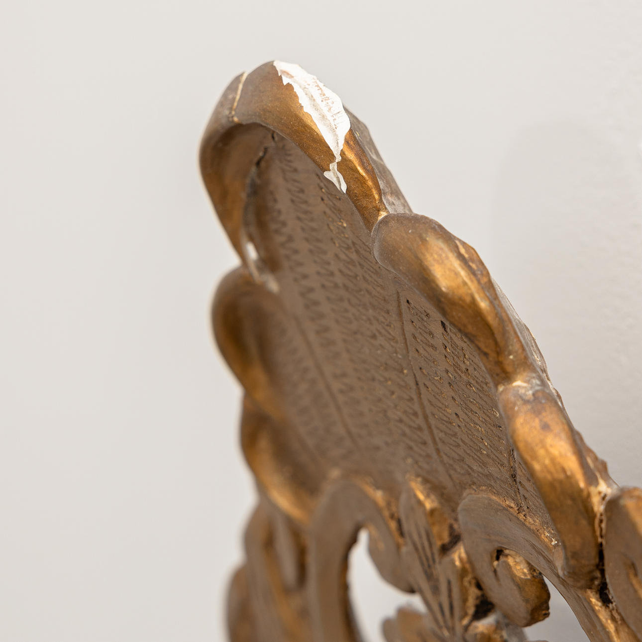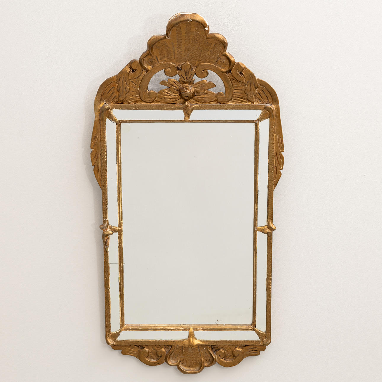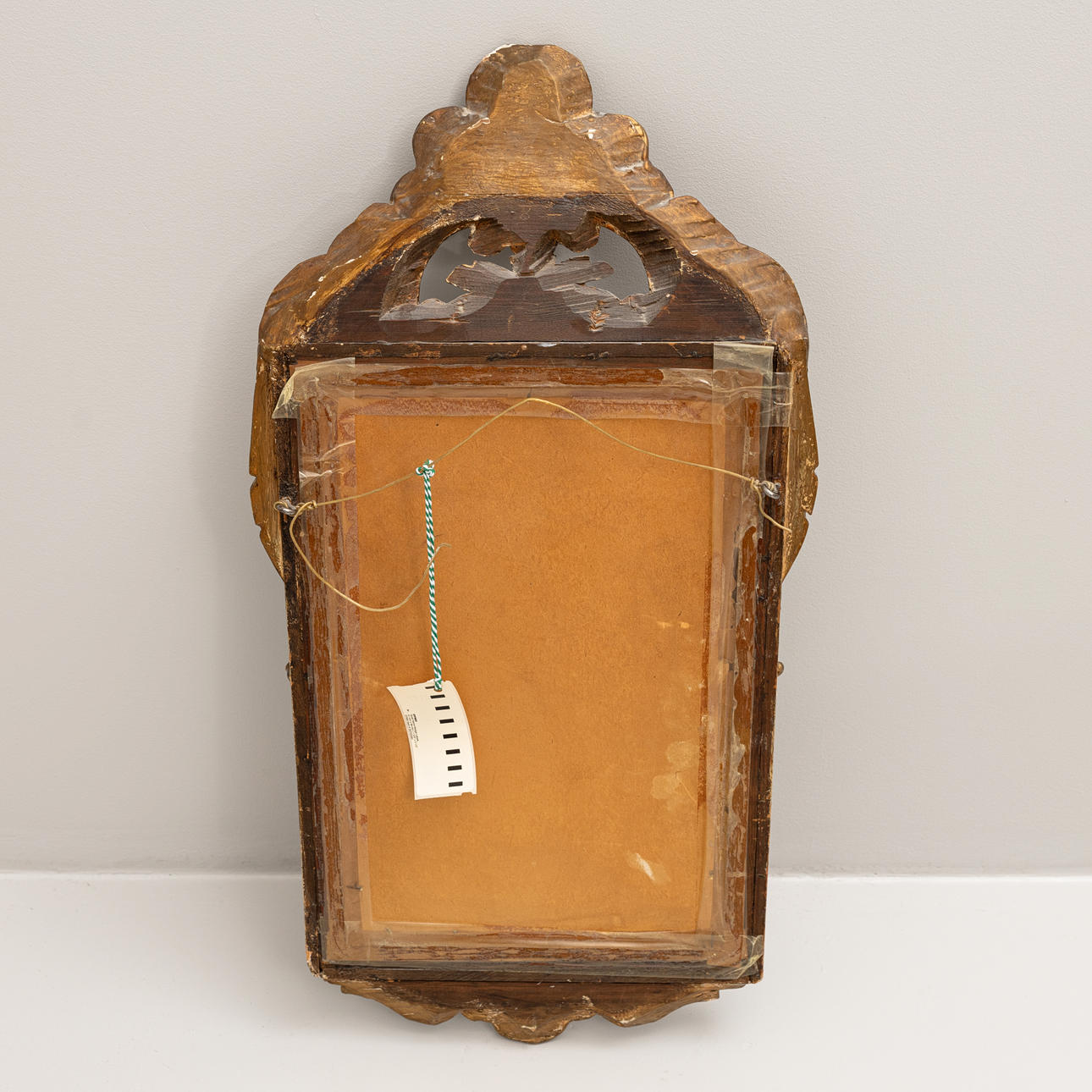 Wear, damage and repairs to the decor, paint loss, a side glass with a crack. Mirror glass with stains. Cardboard backing tapes.