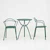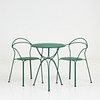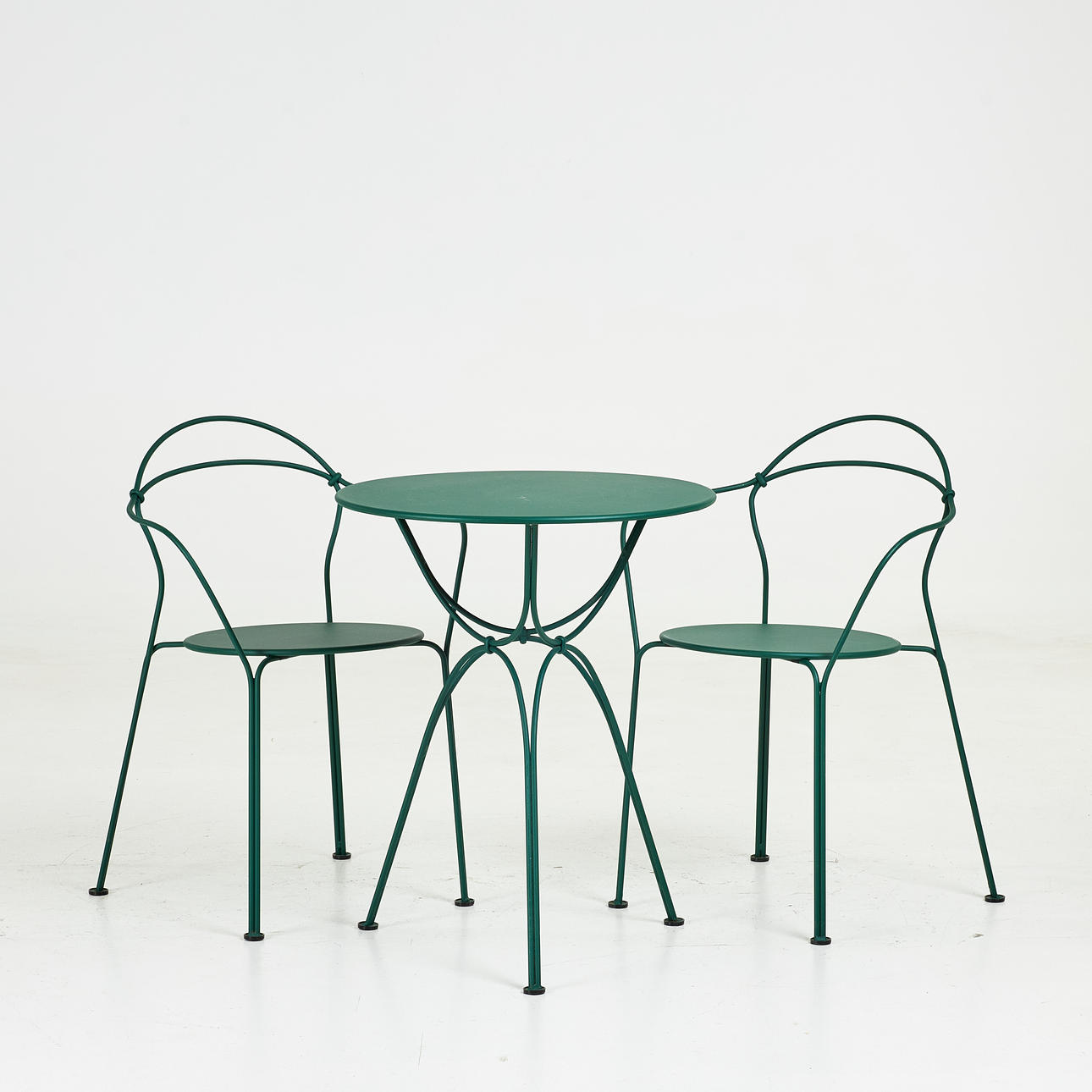 4392314. FRÉDÉRIC SOFIA. TABLE and 2 ARMCHAIRS, “Airloop”, Fermob, green lacquered metal.