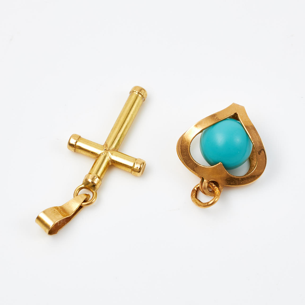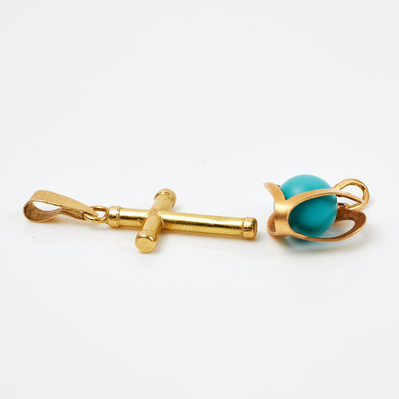 PENDANTS 2 pcs, 18 k gold, round cut turquoise.