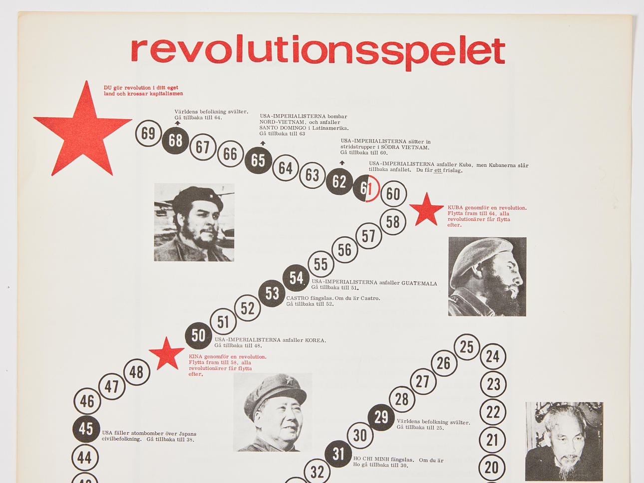 THE REVOLUTION GAME. Group 16 FISH (1968). Printed playing field in red and black, photo illustrated (e.g. Lenin and Mao), text on the back with the exhortation “Crush Capitalism”. Approx. 418x295 mm. Something nutty in the corners.