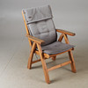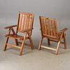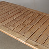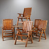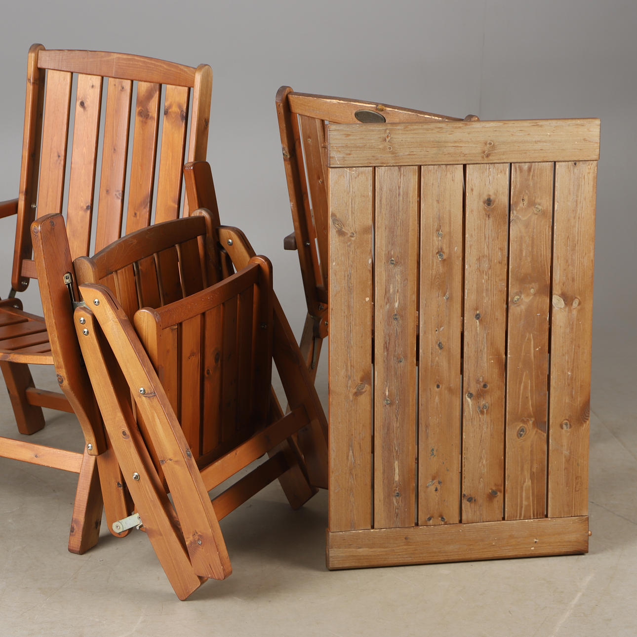 Table with 6 folding armchairs and a folding top. Table length 165, width 95, height 72 cm. Disc width 60 cm. 6 pads included.