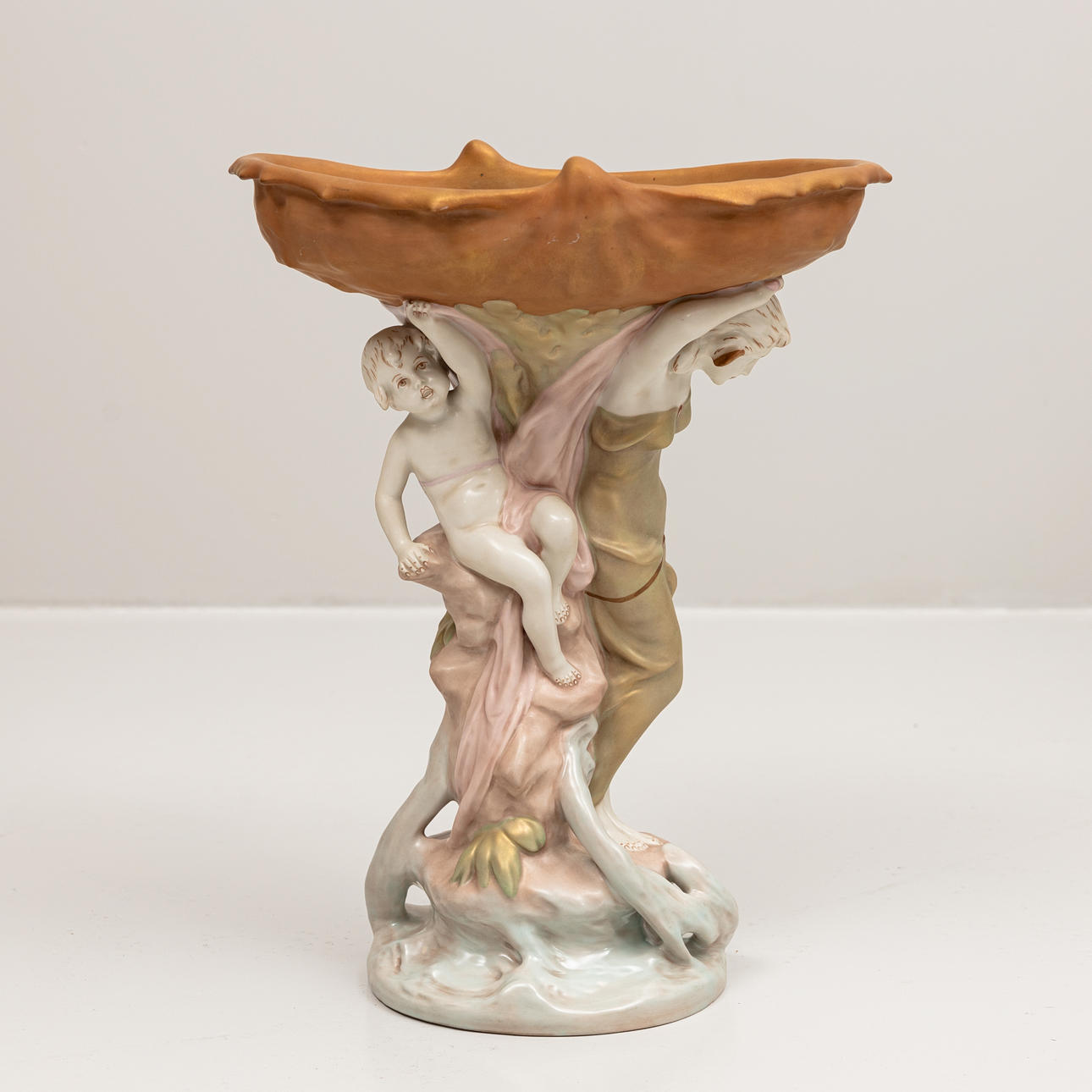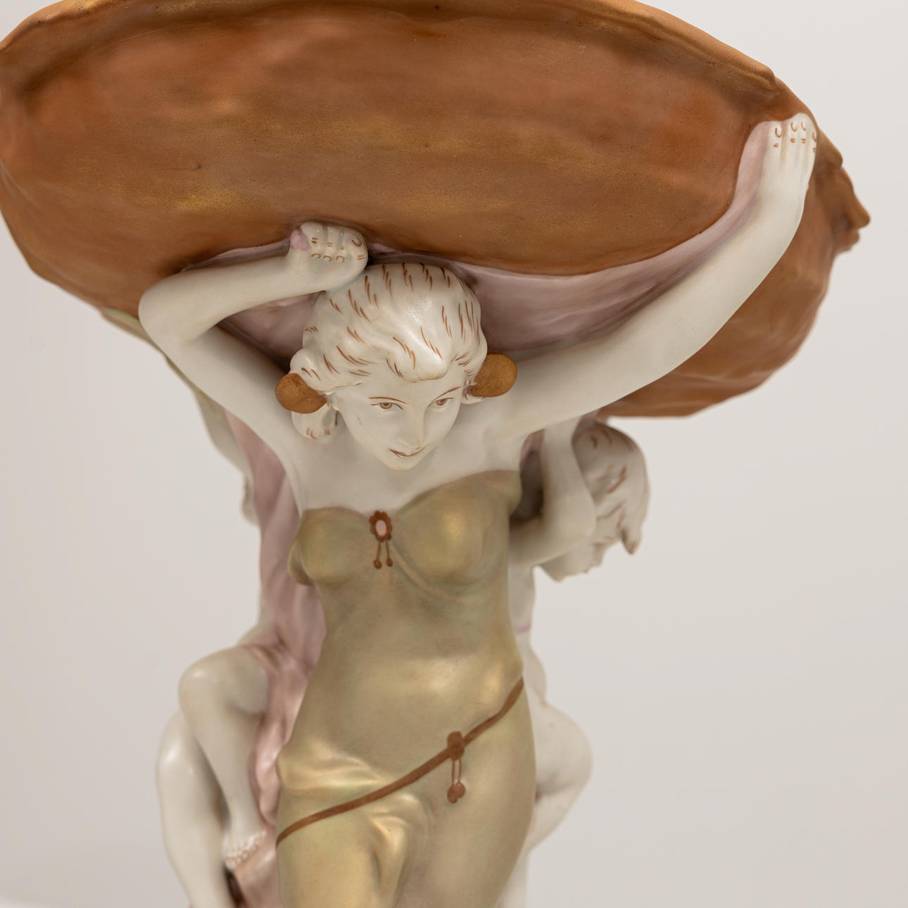 Woman and putti carrying a deep saucer, height approx. 51 and width 39 cm.